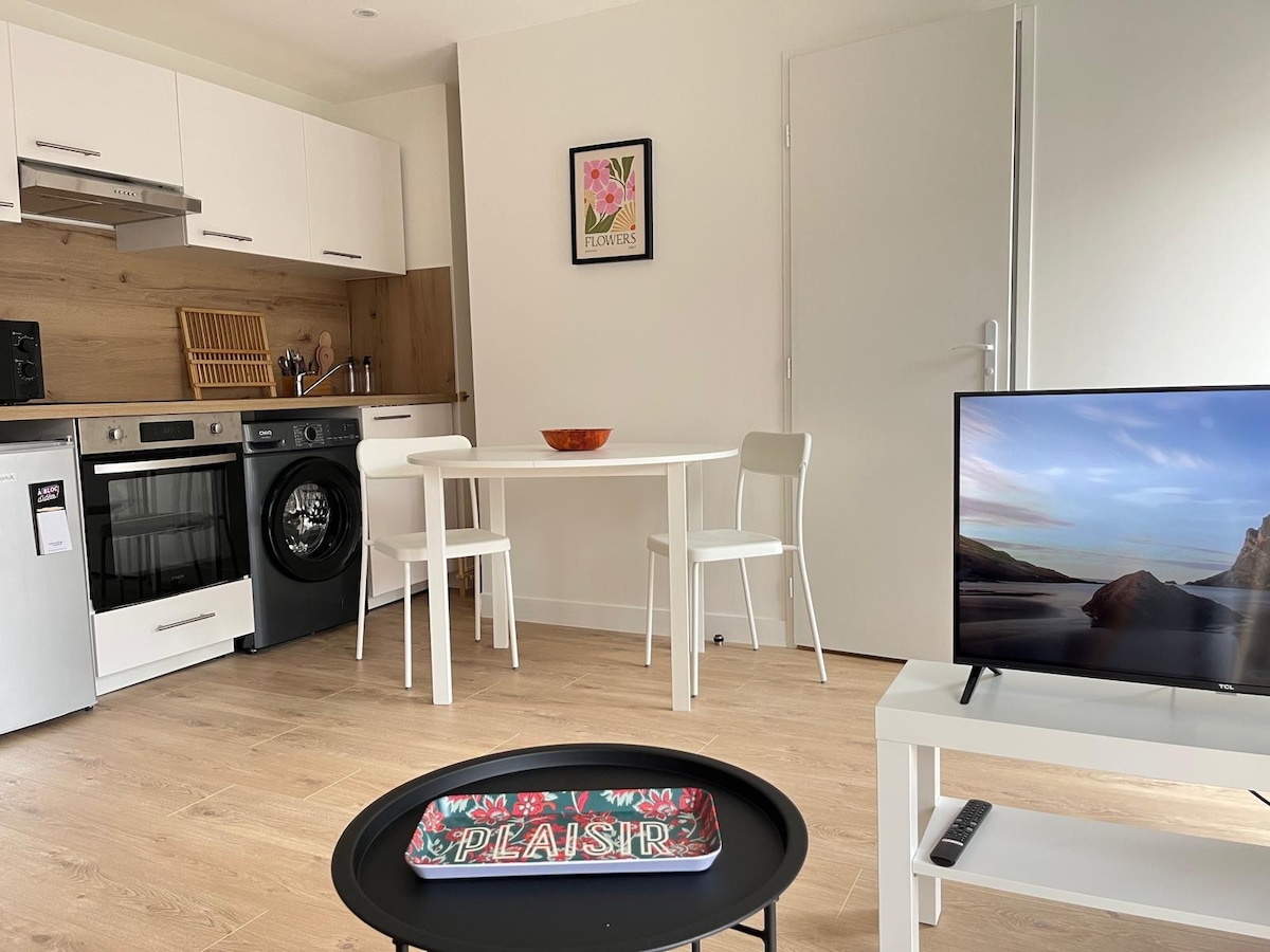 Très bel appartement situé à saint etienne. Entièrement neuf Dispose d’une chambre et cuisine équipée plaque induction micro onde réfrigérateur machine à café thé machine à laver, salle de bain, sèche cheveux connecté fibre Netflix gratuit 250 m du zénith, du fil et du Parc expo, cite du design, restauration salle de sport 100m de la comédie 700 m du stade Geoffroy Guichard Arrêt de bus et de tram à proximité Parking du zénith et stationnement à proximité gratuit immeuble sécurisé