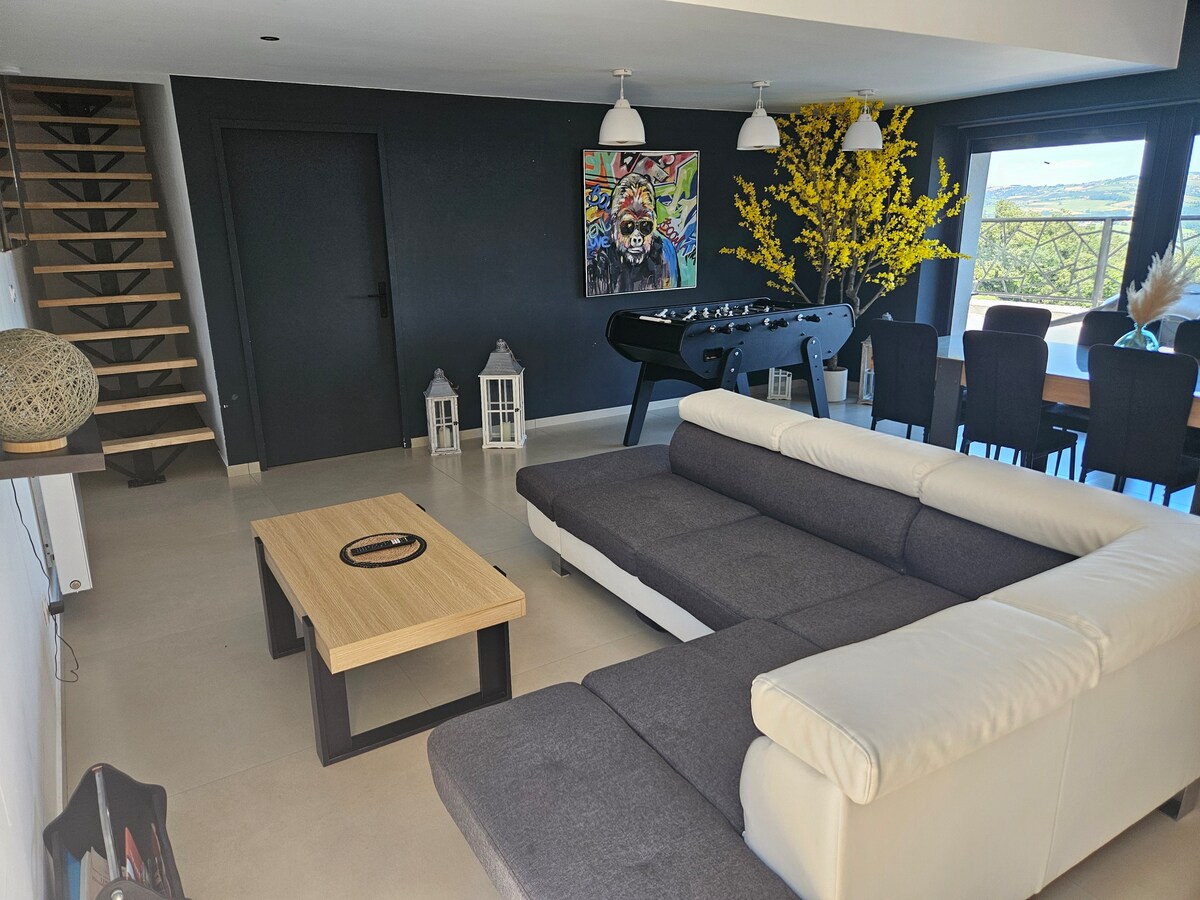 Oubliez vos soucis dans ce logement spacieux en famille ou entre amis Complètement aménagée, et meublée à neuf cette maison est lumineuse et climatisée. En RDC séjour, salle à manger, cuisine équipée, salle de bain WC suspendu, 1 chambre avec lit 2 places et sa balnéo 2 personnes. A l'étage 2 chambres avec 3 lits 2 places.Chaque chambre possède une TV connectée. Canapé convertible en lit 2 places. Il est possible d'accueillir 10 personnes à couchées.Grande terrasse avec sa superbe vue.