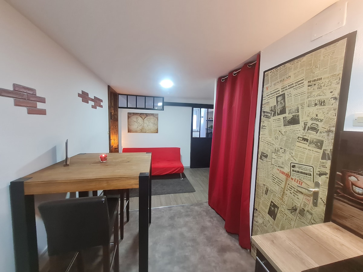 Appartement au calme de 35m2 au Rdc d'un petit immeuble. Situation centrale dans Remiremont (Moins de 2 minutes des Arcades et des commerces du centre ville, 10 minutes à pied de la gare). Parking payant dans la rue, gratuit à 100 mètres. Entrée autonome dans l'appartement via une boîte à clé. Un lit bébé et un rehausseur sont à votre disposition sur demande. 1 chambre avec un lit 140 et SDB attenante. Salon avec canapé convertible, TV LED, Fibre. Draps et linges compris dans la location
