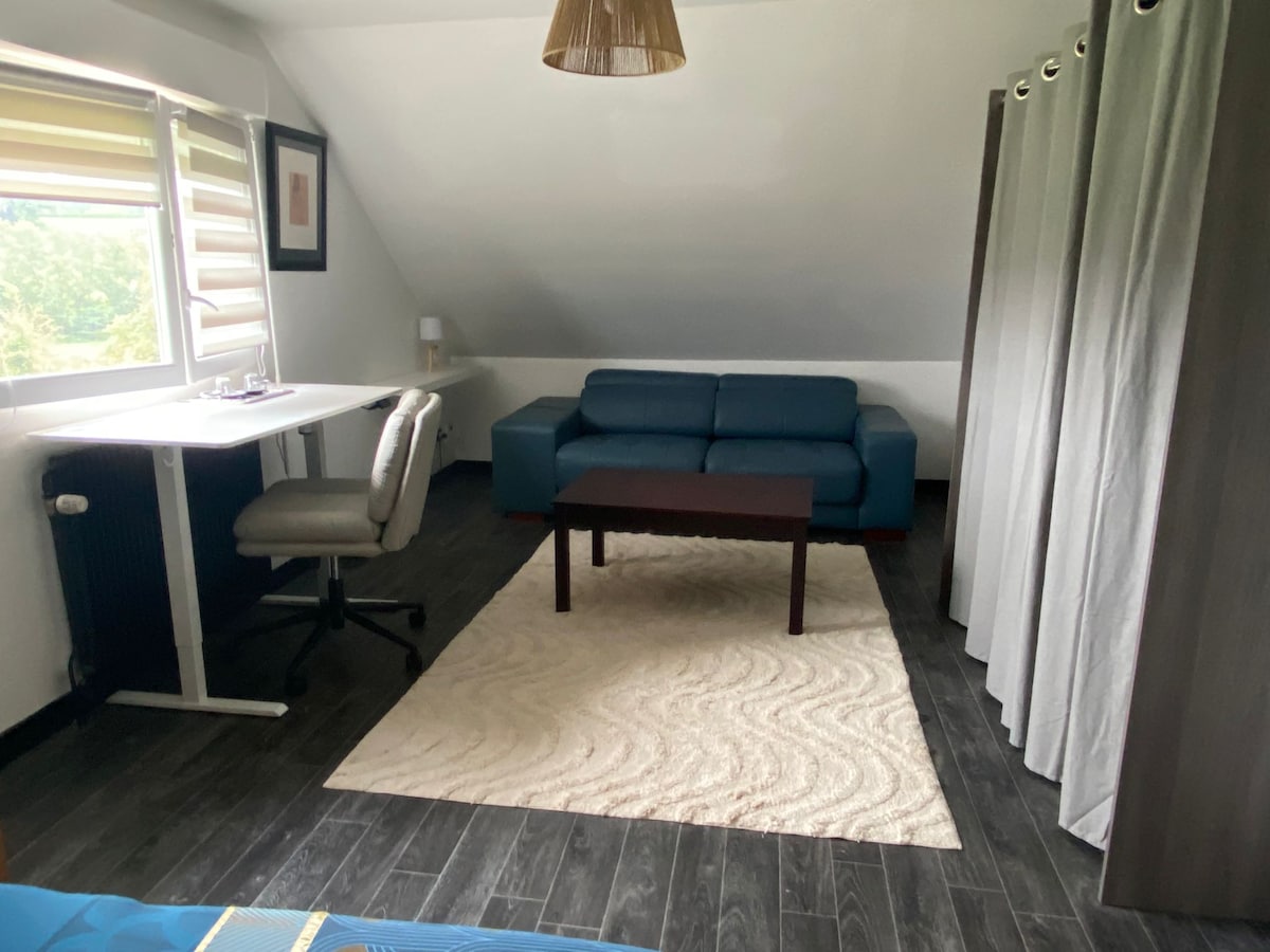 Studio indépendant et élégant de 48 m² dans une maison individuelle, pouvant accueillir 2 personnes. Il est équipé d'une kitchenette, d'une chambre, d'un espace bureau, d'un coin salon avec télévision et d'une salle de bain et WC séparés (lit bébé et chauffeuse sur demande). Un espace détente à découvrir ;) Serviettes de toilette et linge de lit compris dans le prix. Le logement dispose également d'une cour pour stationner et d'un jardin privé (table de jardin, table de ping-pong).