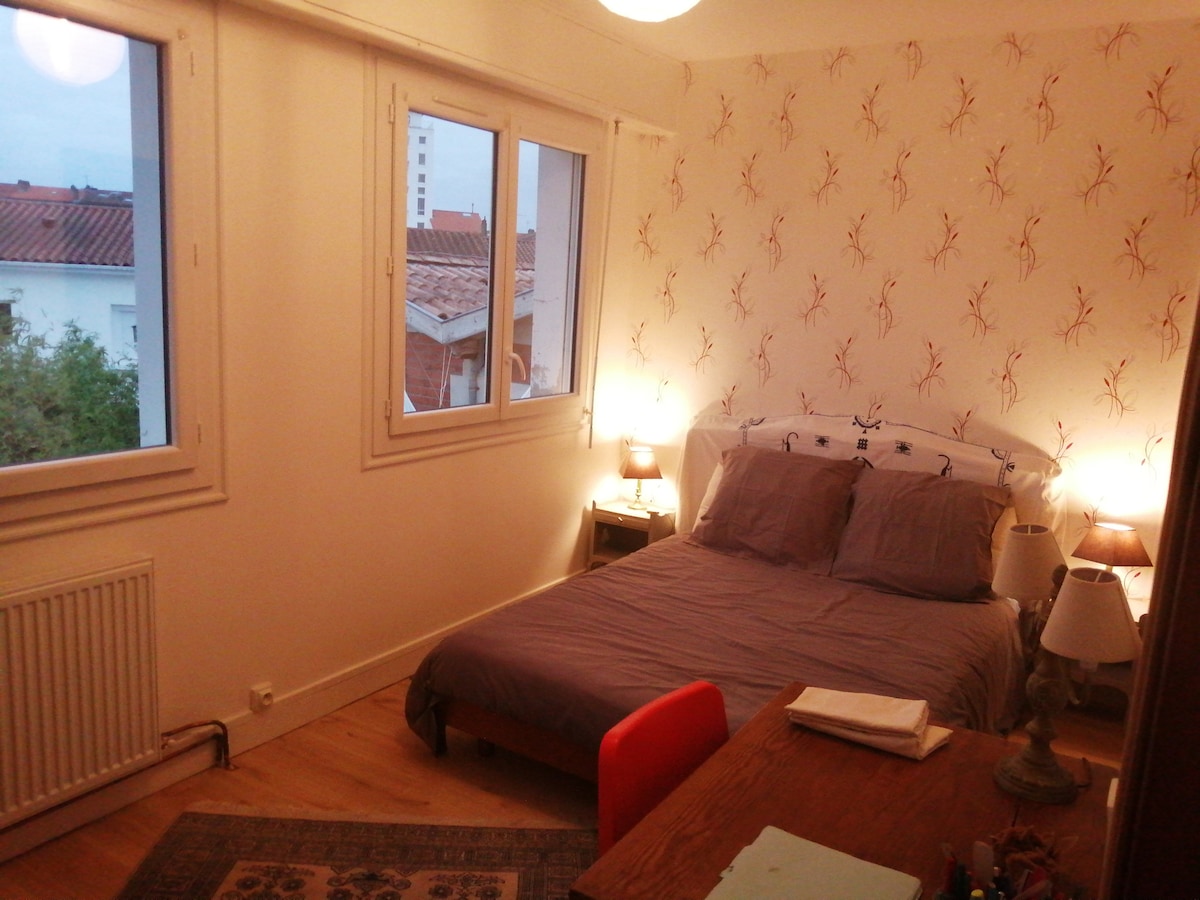 Dans maison particulière, grande chambre avec palier/mezzanine occupant tout l' étage, l'ensemble équipé d'1 lit 1 place de 90cm et de 2 lits de140cm (+lit parapluie possible) avec douche, lavabo et wc : 5 personnes peuvent y être accueillies facilement (+ 1 bébé). Literie, serviettes de toilette et ménage inclus dans le prix. Petit déjeuner possible sur demande. Maison à proximité de commerces et du lycée Bellevue, à 15mn à pied du centre ville. Stationnement facile et gratuit à proximité.