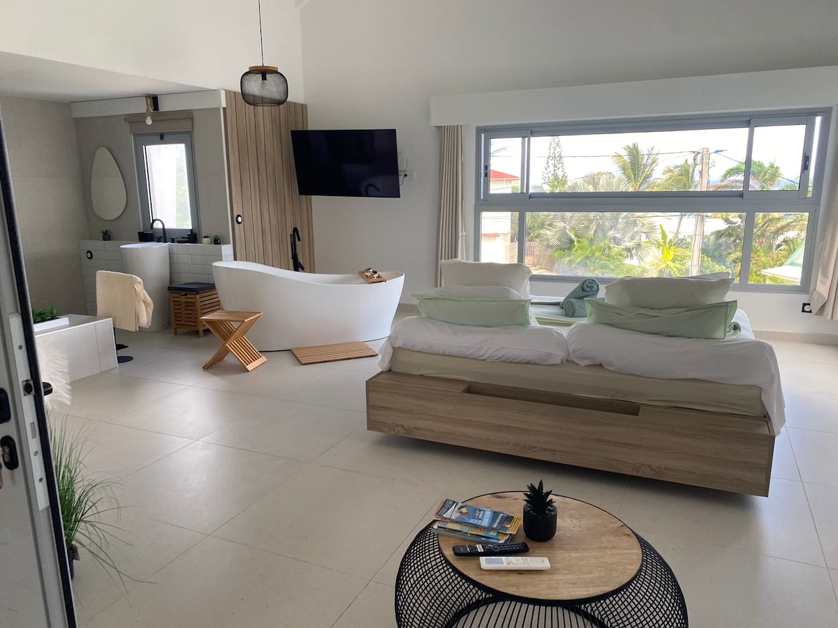 Studio « Mahana ☀️ » Situé en plein cœur de la station balnéaire de St-Francois, à deux minutes à pieds de la marina, localisation exceptionnel pour profiter de vos vacances. Le studio est très cosy et bien aménagé, il allie calme, confort et proximité avec tous les commerces. La résidence dispose d’une piscine Le studio est entièrement équipé et le linge de maison est fourni ; serviettes de toilettes, draps etc… wifi, télévision, Climatisation, sèche cheveux. Ti- punch offert a l’arrivée.