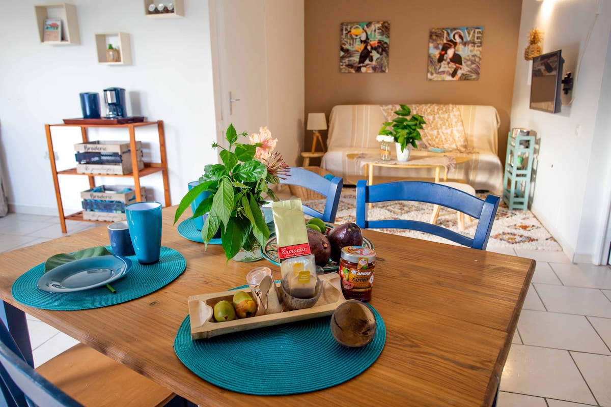 Un bungalow climatisé au coeur d'un jardin tropical dans un lieu prisé de Saint François.situation ,calme et tranquillité en sont ses atouts.Ses couleurs chatoyantes lui donnent un style authentique. Sa situation géographique ,(près des plages et du centre ville),son calme et son confort en font un logement très agréable. Sa proximité avec de beaux hôtels en fait un lieu prisé de saint François.