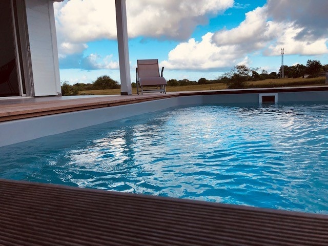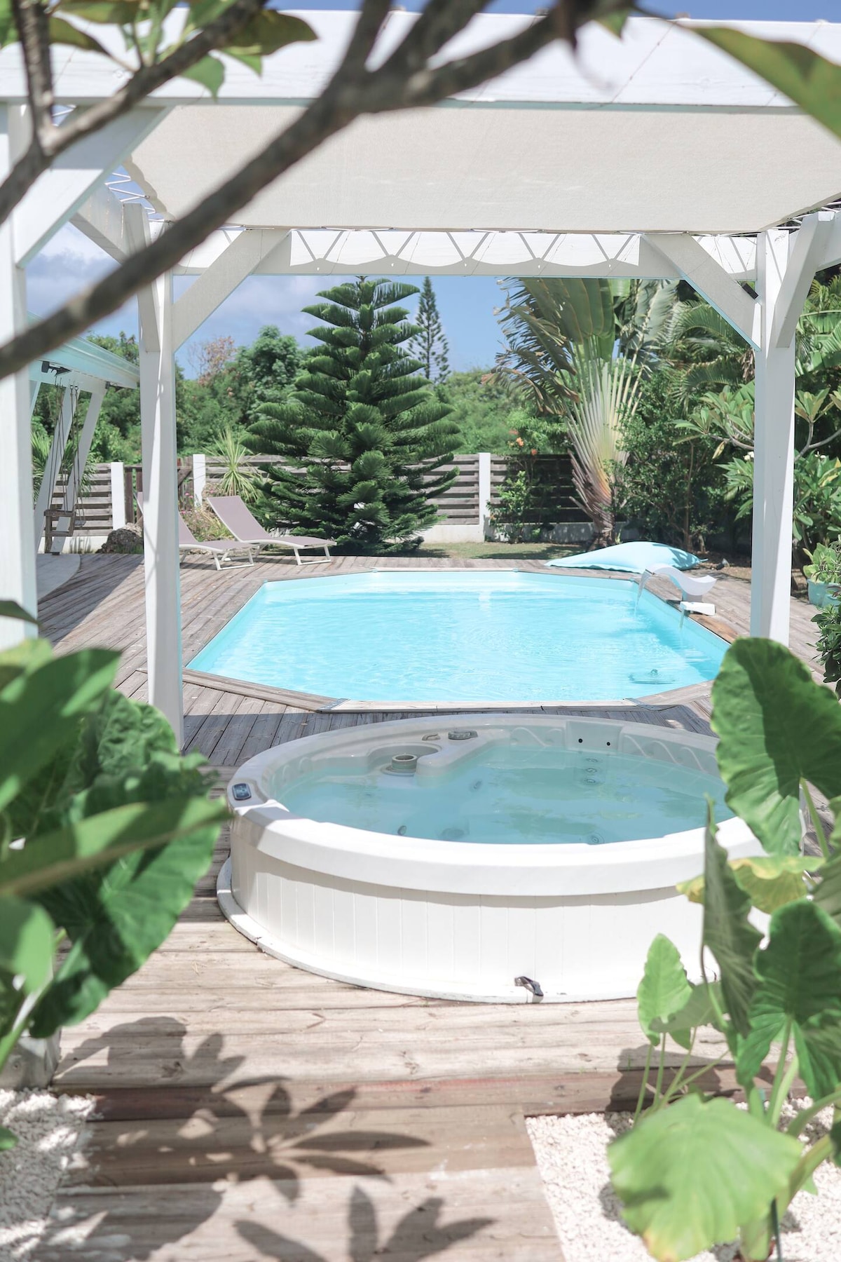 Villa with private pool in Saint-François, Guadeloupe. Rated 4 stars. Enjoy the peace and security of the countryside, in a quiet family area. The villa is for adults only and can accommodate a maximum of 2 people. It is fully fenced, with painted wooden fencing and wire netting with a privacy screen. An electric gate gives you access to your private car park (for 1 car), directly in front of the entrance to your accommodation.