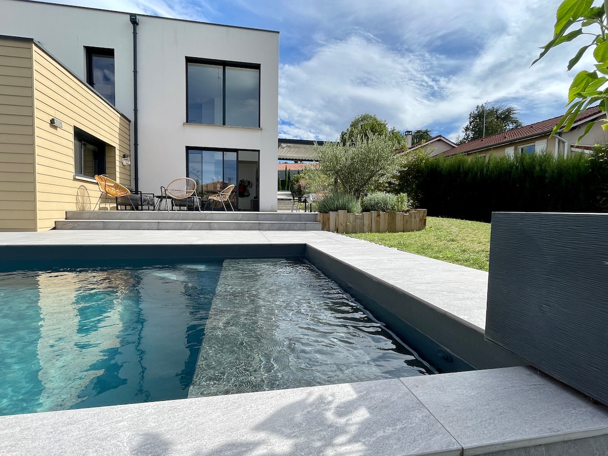 No rent for party or only swimming pool use . House (90m²) in full ground floor part independently of the first floor used by the owner. 2 rooms (25m²) with 2 independant toilets and bathrooms. Located near A72 highway (1 km), tramway (300 m) and north hosptial (1,5 km). Very quiet street and easy parking. Possibility of patio use and lunch/diner on the deck with private use of swimming pool (to discuss). Ideally : 4 people, possible : 5. English discussion with owner.