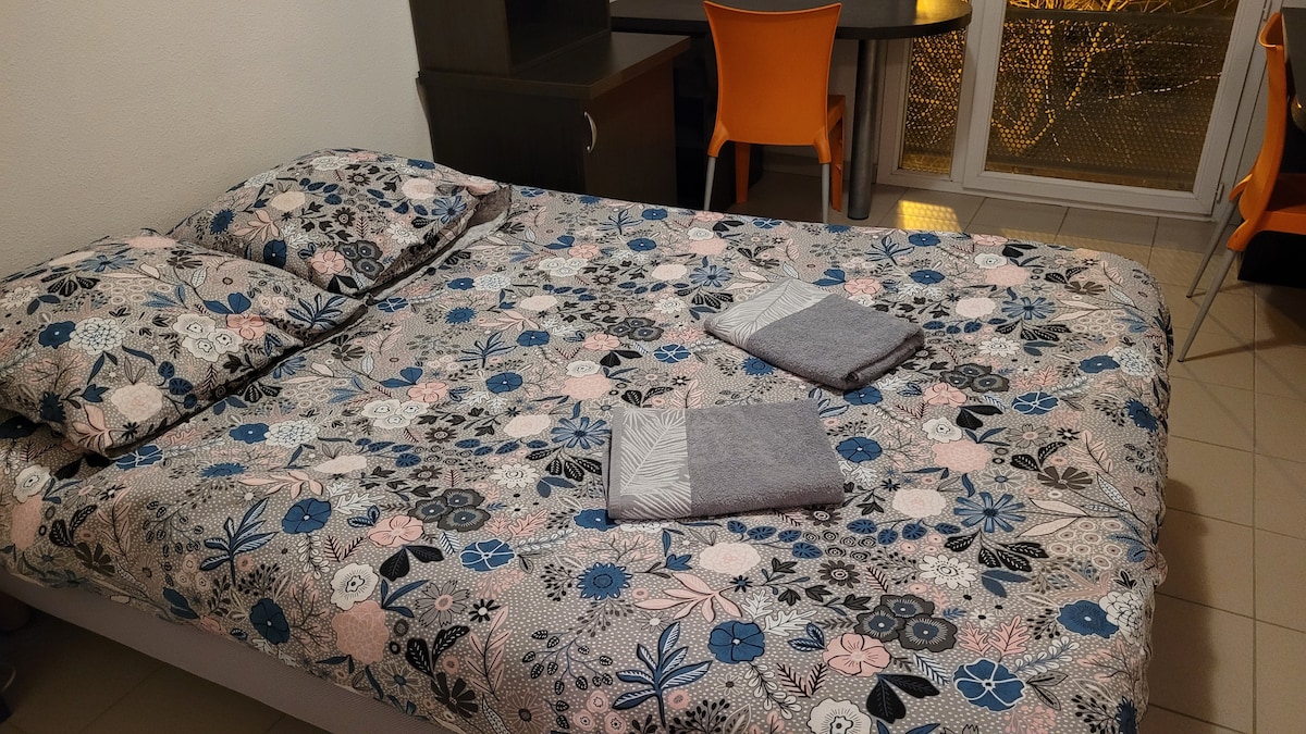 Relax in this independent studio on the garden level of our house. Direct access to private terrace with parking space. Housing located at 0,45 mi. from the tramway, at 22 min walk (1 mi) from the Geoffroy Guichard stadium, at 30 min of tramway from the TGV rail station.