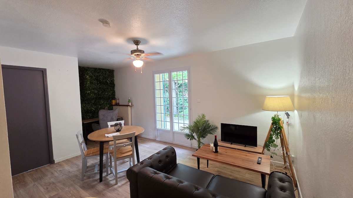Le loft design indépendant de 100 M2 s’ouvre sur un grand espace de vie composé d’un salon, d’une cuisine ouverte et salle de bains au rez-de -chaussée et d’une mezzanine à l’étage. Le salon possède un grand canapé en cuir , un fauteuil et une télévision écran plat. La cuisine ouverte est entièrement équipée avec îlot central. La salle de bain est dotée d'une douche à l’italienne, double vasque, machine à laver et WC. Les deux chambres disposent d' un lit en 160 et d'une penderie.