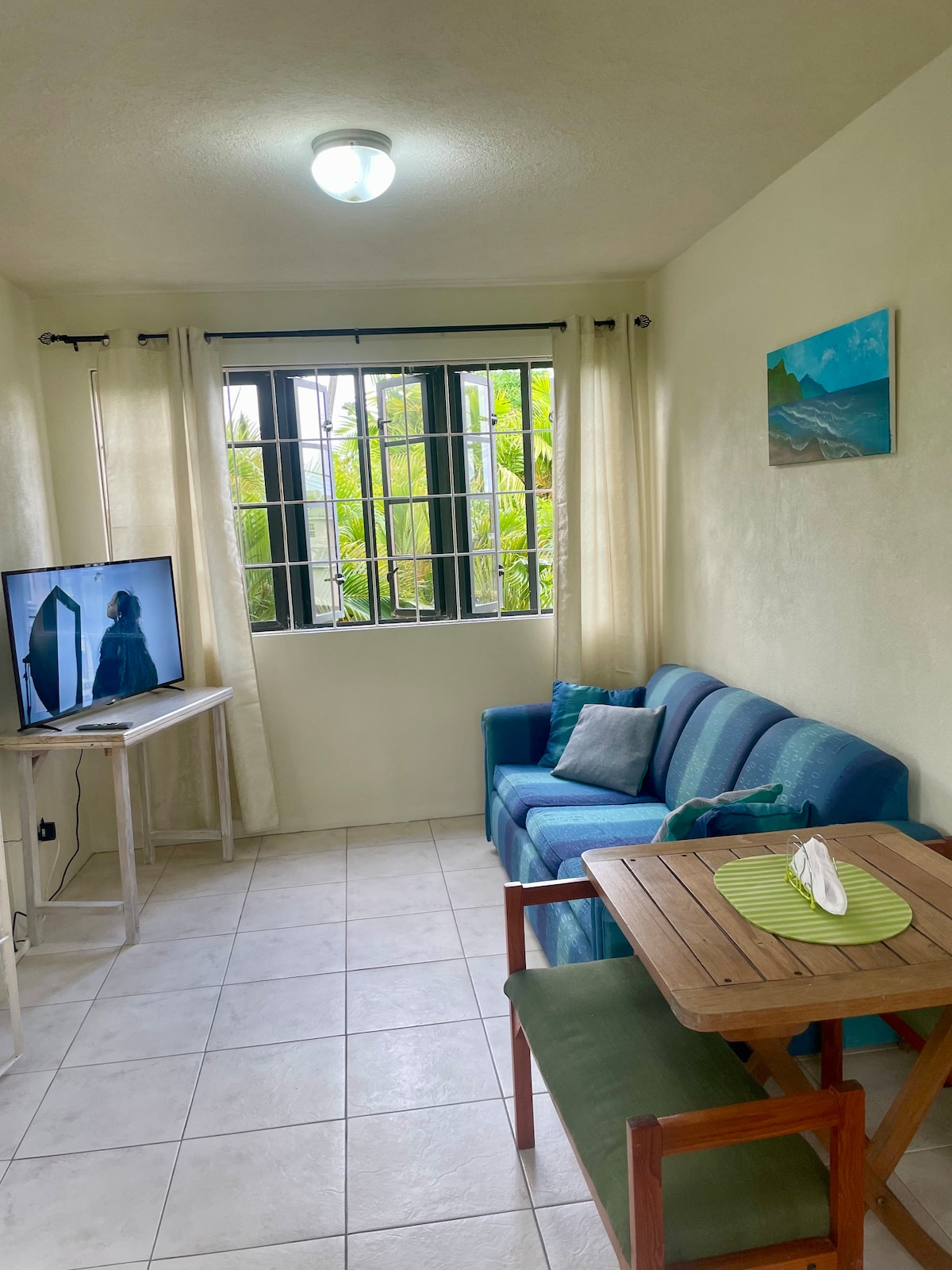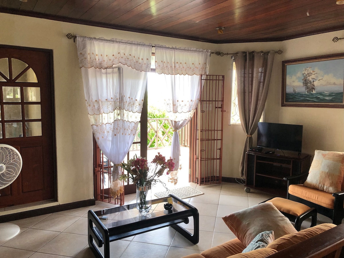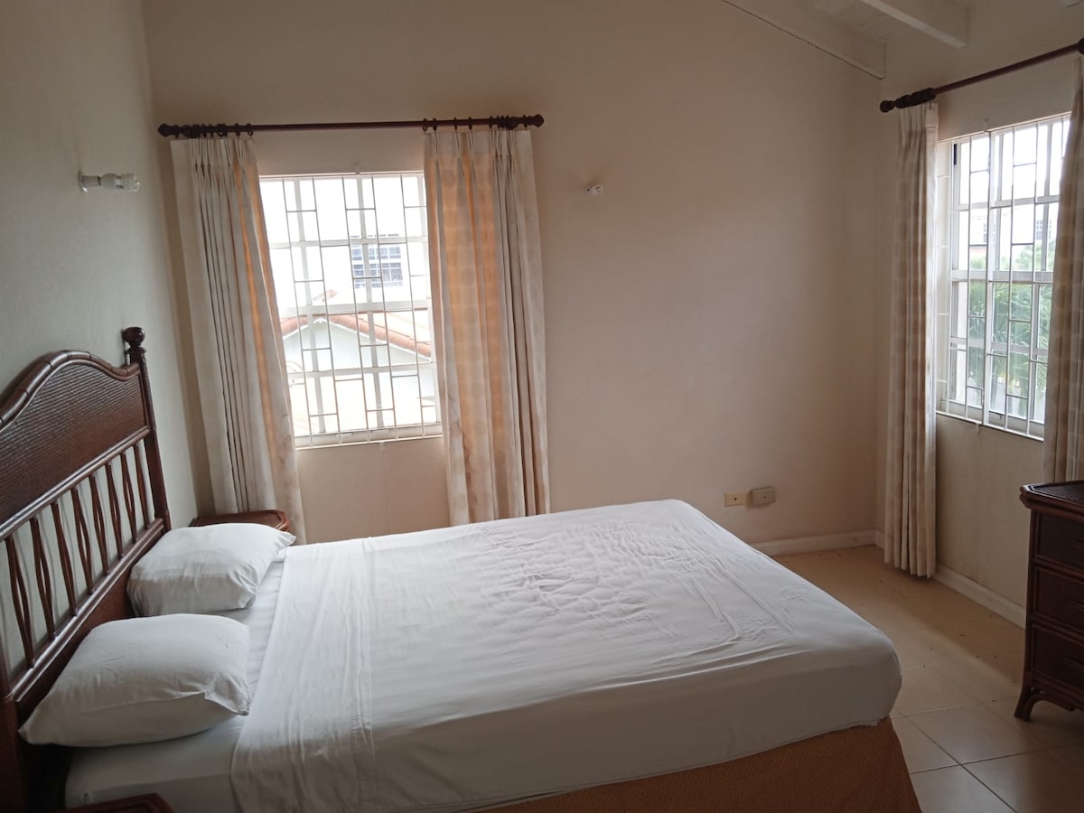 This apartment is centrally located in a very peaceful area. It's surrounded by a lawn, within a residential area that's close to various stores and restaurants. It's a 10 minute drive to the American Embassy, 5 minutes to Sky Mall and 20 minutes to Bridgetown. This apartment is spacious containing a full sized kitchen, living and dining area, a comfortable sized bathroom and a large bedroom. It has free Wi-Fi, microwave, fridge, stove, oven, television, hot water shower and small veranda.