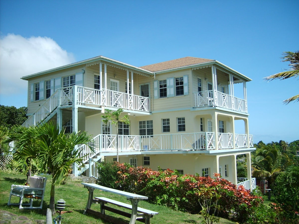 An airy 4-bedroom, 2-story vacation home in Nevis, West Indies, featuring a wrap-around veranda with panoramic views of mountain and sea. Located in the foothills of Mount Nevis, off the beaten track in a quiet island neighborhood. Catch a continuous cooling seabreeze on the back deck, sunbathe at the private pool, enjoy the beautiful tropical foliage.