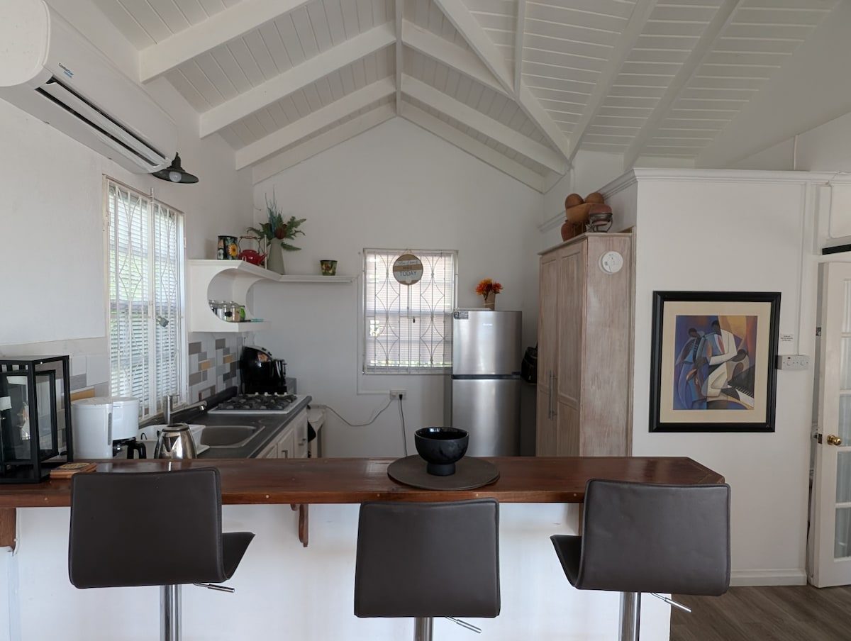 Our whimsical take on the tiny house craze is a gorgeous, rootsy yet modern getaway amidst mango trees and fresh vegetation. An open floor plan makes it feel anything but tiny inside. Our spice island hideaway has all the comforts of home, including a fridge, stove, microwave, flat screen tv, washer/dryer & wifi. Matching bright Caribbean colours with the comforts of home, Miss Tee's Tiny house is a Spice Island Treat just off the beaten path :)