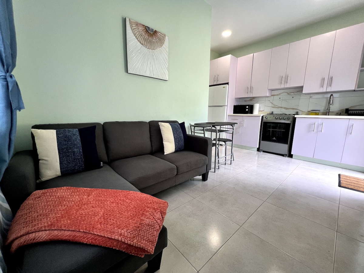 Enjoy Kaibus Place- a quaint home away from home. Kaibus is just steps away from two separate access to two independent beaches. Situated a mere 4 minutes away from the Airport. Kaibus is a well appointed space and includes high-speed WiFi, Smart HD Tv (fire-stick), fully equipped kitchen with cozy bedroom that opens directly onto the balcony/patio. Eating area is also on the balcony/patio. Stackable Washer-Dryer is located in the bathroom. Hotel restaurant is within easy walking distance.