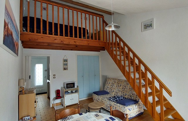 LINGE NON FOURNI NON ADAPTE POUR LES ENFANTS maison de 37m2 claire, calme, agréable dans une petite résidence bien tenue avec piscine, , agencée en un séjour cuisine équipée avec coin télé, un bureau pour le télétravail, une petite chambre, une salle de douche WC, vue sur terrasse jardin arborée, sud, avec coin repas et relax, un garage pour les vélos parking privatif devant le garage non adapté pour grosse voiture a coté de la magnifique plage des huttes et de la foret de Chaucre