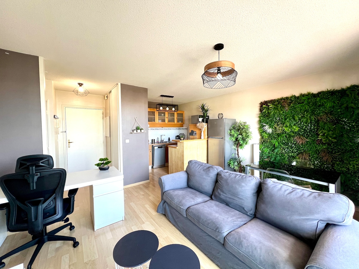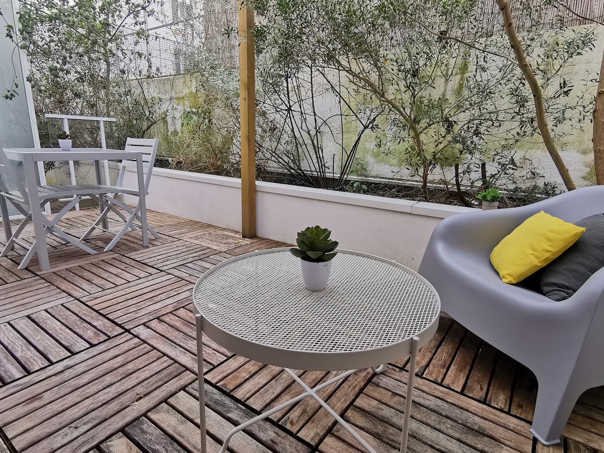 NON ADAPTE POUR LES ENFANTS LINGE NON FOURNI Agreable appartement de 55m2 en rez de jardin, claire, au calme pres d'un grand parc privé et du centre ville, dans une résidence bien tenue, agencé en 3 pièces : un séjour cuisine équipée avec un coin détente, un bureau télétravail , une chambre avec lit de 140, une salle de bain, un WC, le tout donnant sur une grande terrasse jardin de 45m2, plein sud, avec un coin repas, un coin détente relax entouré d’arbres. parking privatif