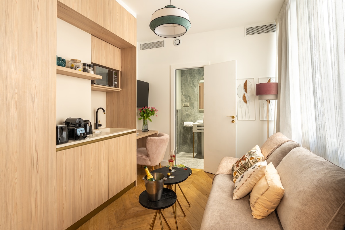 Overlooking our stunning inner courtyard and the charming neighboring church, your pied-à-terre offers open views, incredible natural light, and absolute tranquility—right in the heart of Paris. Each apartment includes a living room with a sofa bed, a dining area with a round table, a beautiful bedroom featuring a luxury hotel–quality bed, a fully equipped open kitchen with a dishwasher and washer-dryer, a shower room, and a separate toilet.