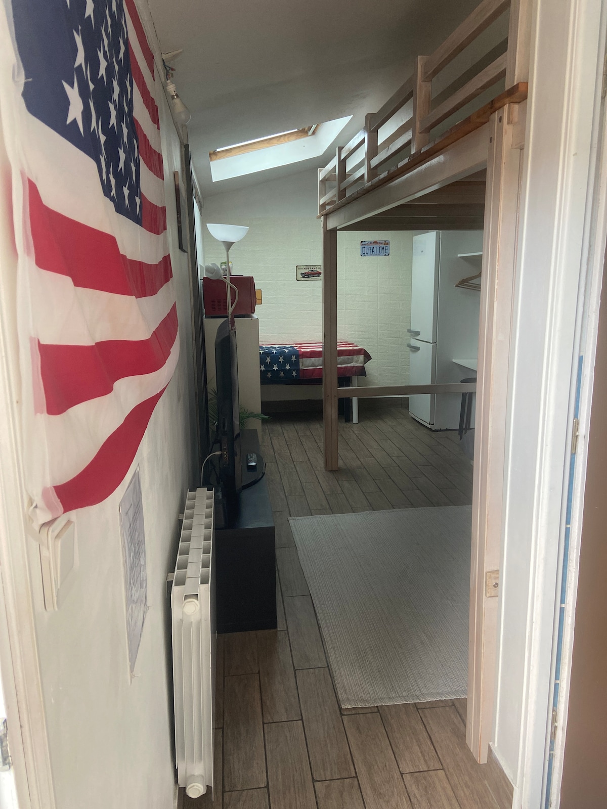 Joli studio de 14/M2,entièrement neuf,équipé à neuf.C’est une maison d’hôte joliment aménagée,située dans notre propriété. Il offre une pièce-salon-cuisine, une salle de douche,Wc, lavabo. Dans la pièce : Canapé 3 places convertible en lit d’appoint avec matelas de 15cm d’épaisseur,couette, oreillers en duvet. Table à manger avec 2chaises, Armoire pour le rangement. La cuisine est équipée de: réfrigérateur,microonde-grille,plaque induction,bouilloire,cafetière,grille-pain,théière,autre.