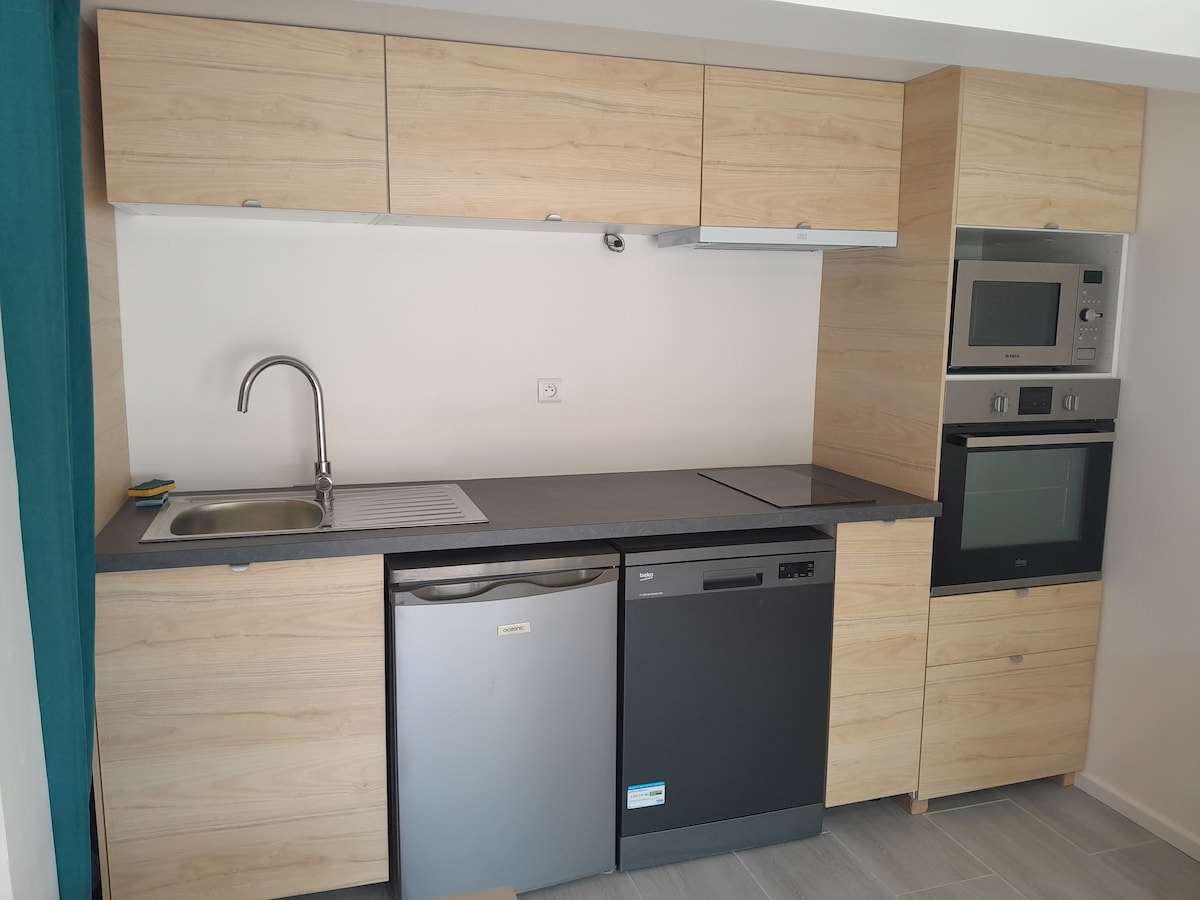 Cuisine entièrement équipée : plaque de cuisson, four, micro-ondes, réfrigérateur-congélateur, bouilloire, grille pain, machine à café, lave-vaisselle et machine à laver. Salle à manger ,salon. Chambre: lit de 160 avec salle de bain. WC séparé. A l étage : Grande Chambre : lit de 140, lit de 90 et un lit bébé. Chambre lit de 140 avec armoire. Salle de bain avec douche. Terrasse extérieur couverte avec salon de jardin, barbecue. Grand jardin privé, non clos.