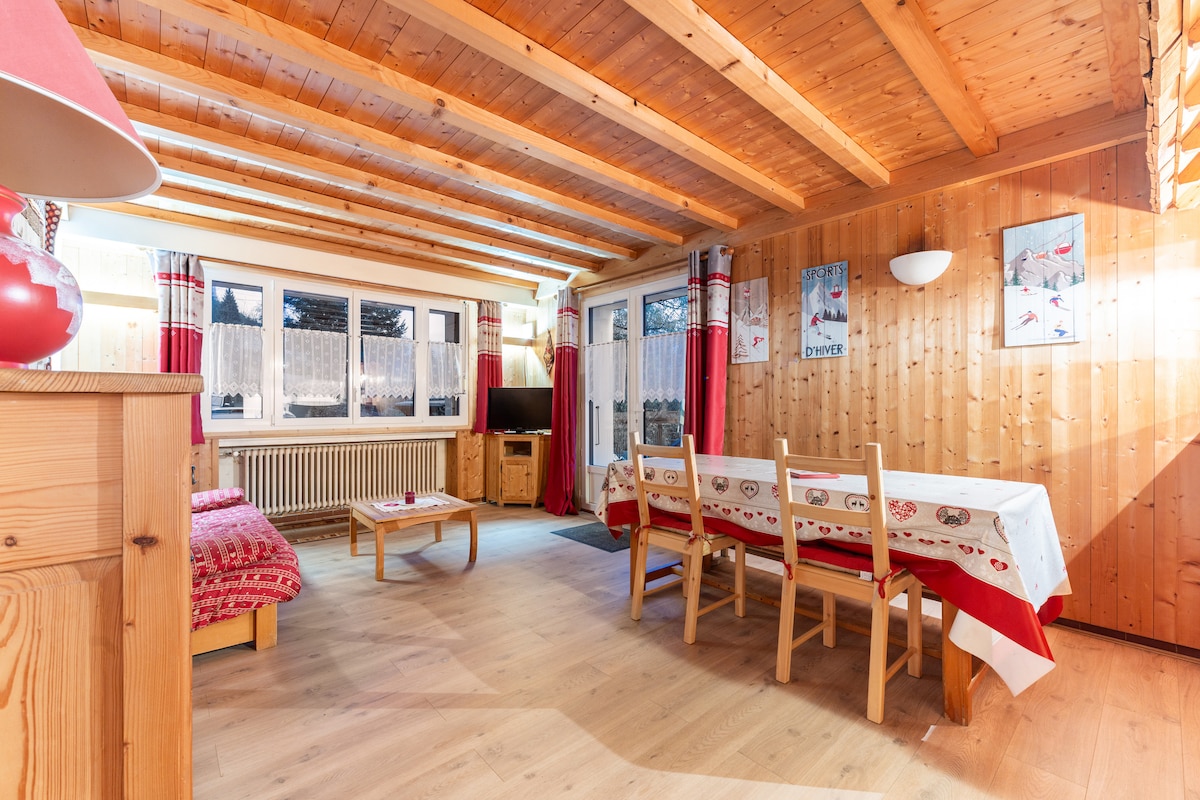 Appartement récent de 45m³ en rez de jardin dans un chalet individuel, disposant d'une grande chambre, d'une cuisine équipée, salle de bain avec baignoire et WC, TV et wifi avec une vue sur la vallée, le village et le massif du Mont Blanc. L'emplacement permet un départ "ski aux pieds", arret navette village devant le chalet, ou acces en voiture a 5mn. Proximité des restaurants et commerces. Arrivée autonome par coffre à clé. Idéal pour un couple, ou une petite famille!