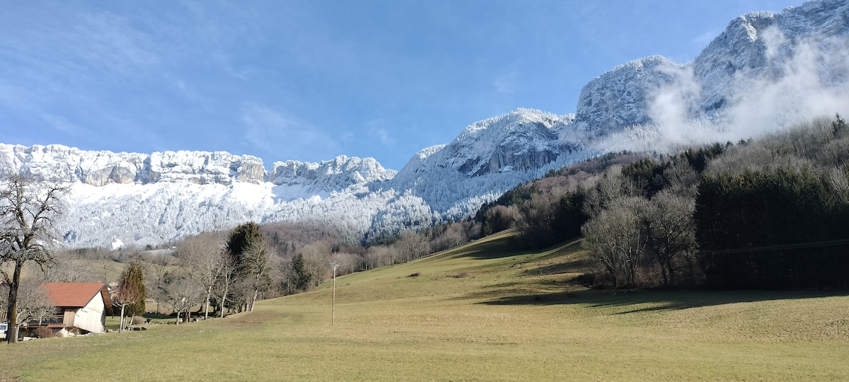Confortable chambre d'hôtes dans petit village à 800m d'altitude, à 10mn des stations du Grand-Bornand, La Clusaz, 20 mn du lac d'Annecy, 45 mn de Genève. Grande pièce à vivre avec 1 lit 140 dans alcôve , 1 lit 90 dans salon, canapé, Salle de bain spacieuse : baignoire , douche à l'italienne, Entrée privée, balcon privatif ensoleillé, salle pour dépôt vélos, skis etc..... Notre maison d'hôtes vous ouvre ses portes , pour profitez des bienfaits de la montagne.