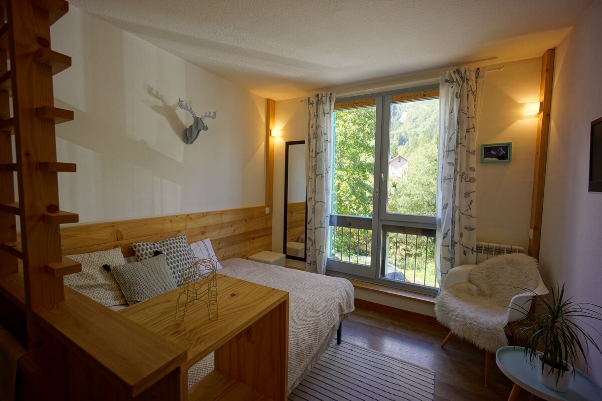 Vous recherchez un agréable séjour à Chamonix? Nous vous proposons un joli studio au cœur de Chamonix, au calme sans vis à vis. A proximité immédiate de l'aiguille du midi, des commodités et des transports. Belle vue Brévent! Bus à tarif avantageux et trains gratuits dans la vallée grâce à la "Carte d'hôte" remise à votre arrivée. Nous fournissons tout le linge de maison , papier wc, liquide vaisselle, éponge, basiques cuisine (thé, café, huile, sel poivre, sucre...) Lit fait à l'arrivée.