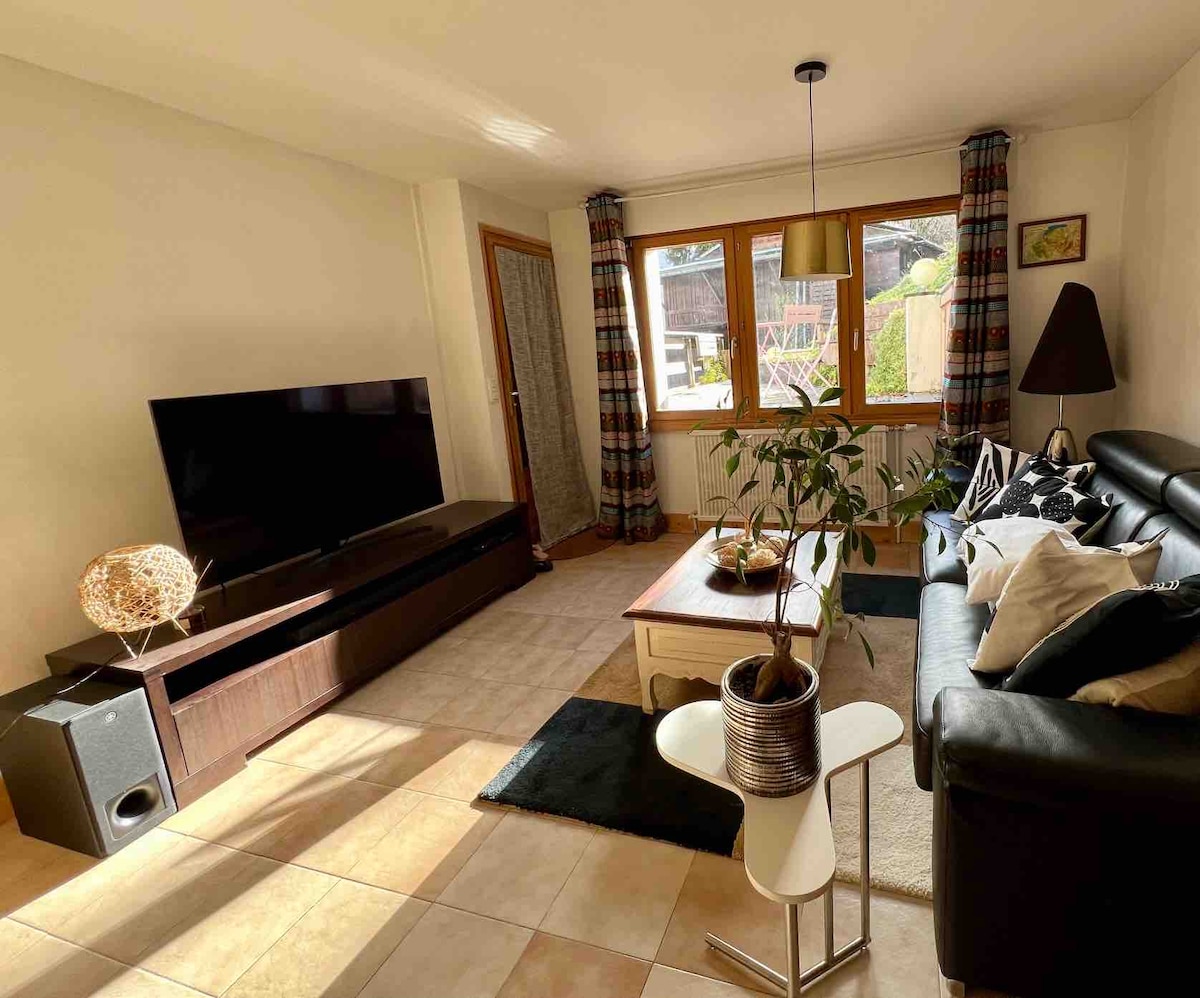 Appartement récent de 45m³ en rez de jardin dans un chalet individuel, disposant d'une grande chambre, d'une cuisine équipée, salle de bain avec baignoire et WC, TV et wifi avec une vue sur la vallée, le village et le massif du Mont Blanc. L'emplacement permet un départ "ski aux pieds", arret navette village devant le chalet, ou acces en voiture a 5mn. Proximité des restaurants et commerces. Arrivée autonome par coffre à clé. Idéal pour un couple, ou une petite famille!