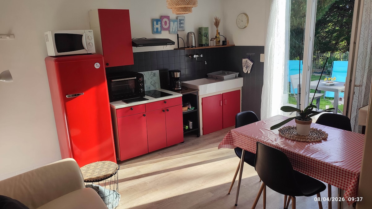 LOGEMENT CLASSE EN MEUBLE DE TOURISME ** Maisonnette confortable et climatisée, située au fond du jardin du propriétaire, indépendante, à proximité des commerces et restaurants, à 900 m de la plage, de la forêt et des pistes cyclables. (Vélodyssée).Vous apprécierez mon logement pour le quartier, les espaces extérieurs, la luminosité et le calme. Prêt de deux vélos. Possibilité de louer des draps et serviettes 16 euros . Frais de ménage de 30 euros facultatifs A payer via le site Airbnb Wifi