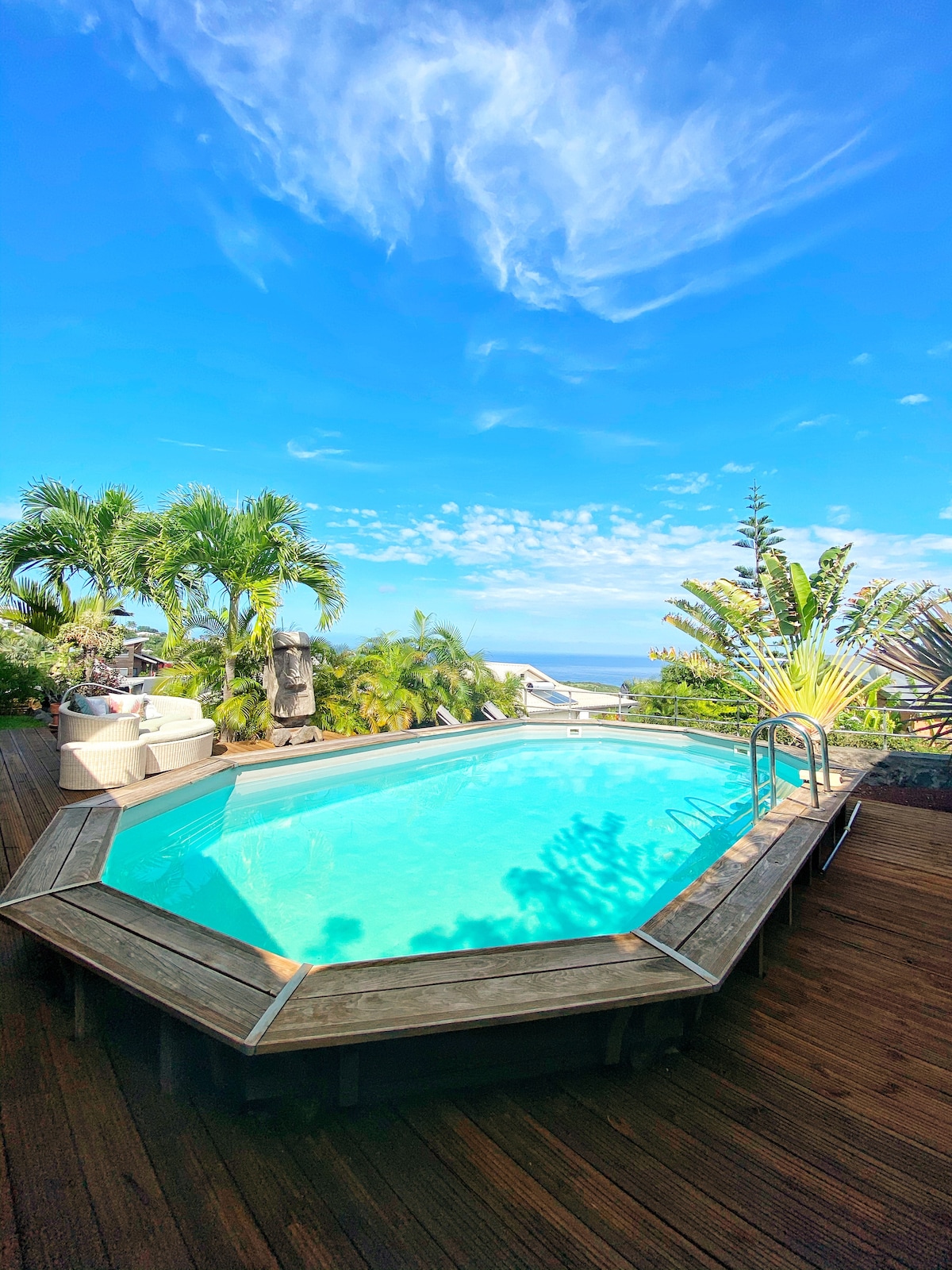 Logement proche de la plage accessible à pieds, equipé d'un jacuzzi privatif avec vue mer et montagne depuis le jacuzzi. Il est au premier étage. Profitez d'une situation exceptionnelle proche du lagon. Fêtes interdites. Le jacuzzi est accessible à toute heure, cependant les buses de massages sont programmées jusqu’à 21h et reprennent à 8h. TARIF DÉGRESSIF SELON DURÉE