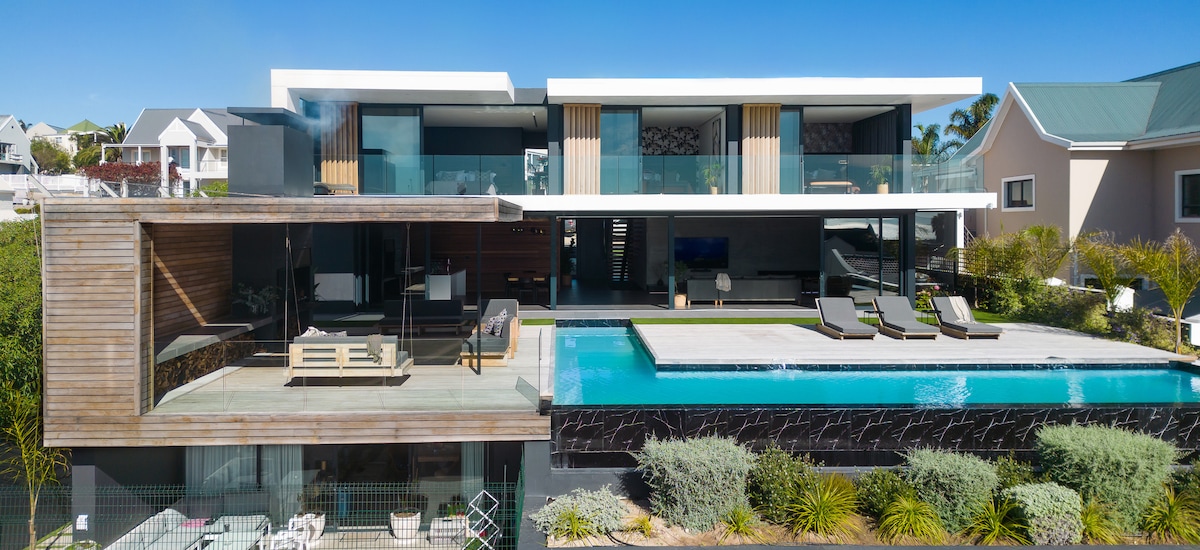 Villa Oasis is a luxurious architectural retreat overlooking the Langebaan Lagoon. Designed as an immersive oasis, it features cascading waterfalls, lush tropical gardens, a waterfall pool, tan deck, large outdoor/ indoor entertainment, 3x luxury ensuite bedrooms, a private gym, designated office space, full home automation with bespoke lighting. This tropical-inspired sanctuary blends cutting-edge design with serene coastal views offering an unforgettable 5-star experience in nature’s embrace.