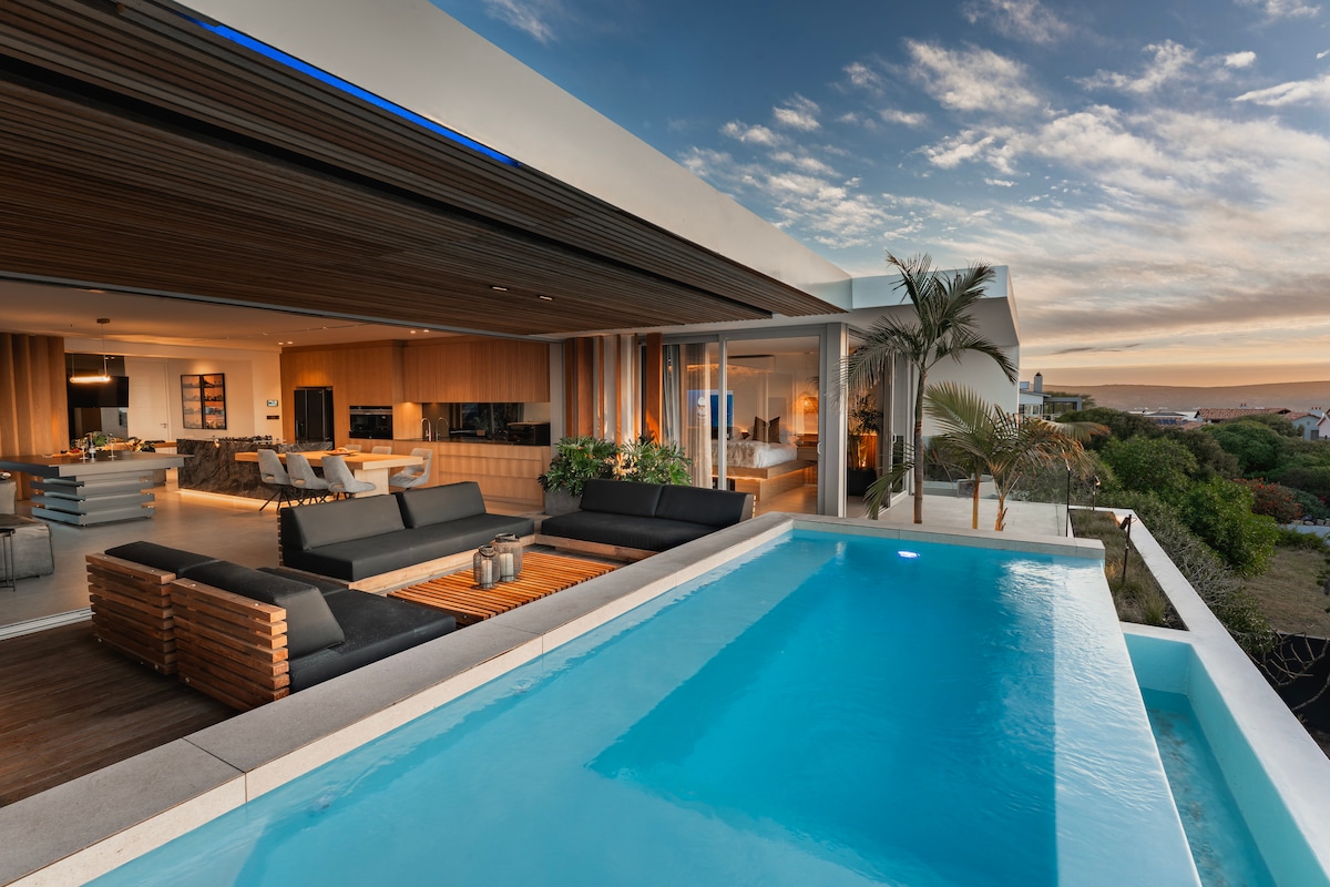 Villa Oasis is a luxurious architectural retreat overlooking the Langebaan Lagoon. Designed as an immersive oasis, it features cascading waterfalls, lush tropical gardens, a waterfall pool, tan deck, large outdoor/ indoor entertainment, 3x luxury ensuite bedrooms, a private gym, designated office space, full home automation with bespoke lighting. This tropical-inspired sanctuary blends cutting-edge design with serene coastal views offering an unforgettable 5-star experience in nature’s embrace.