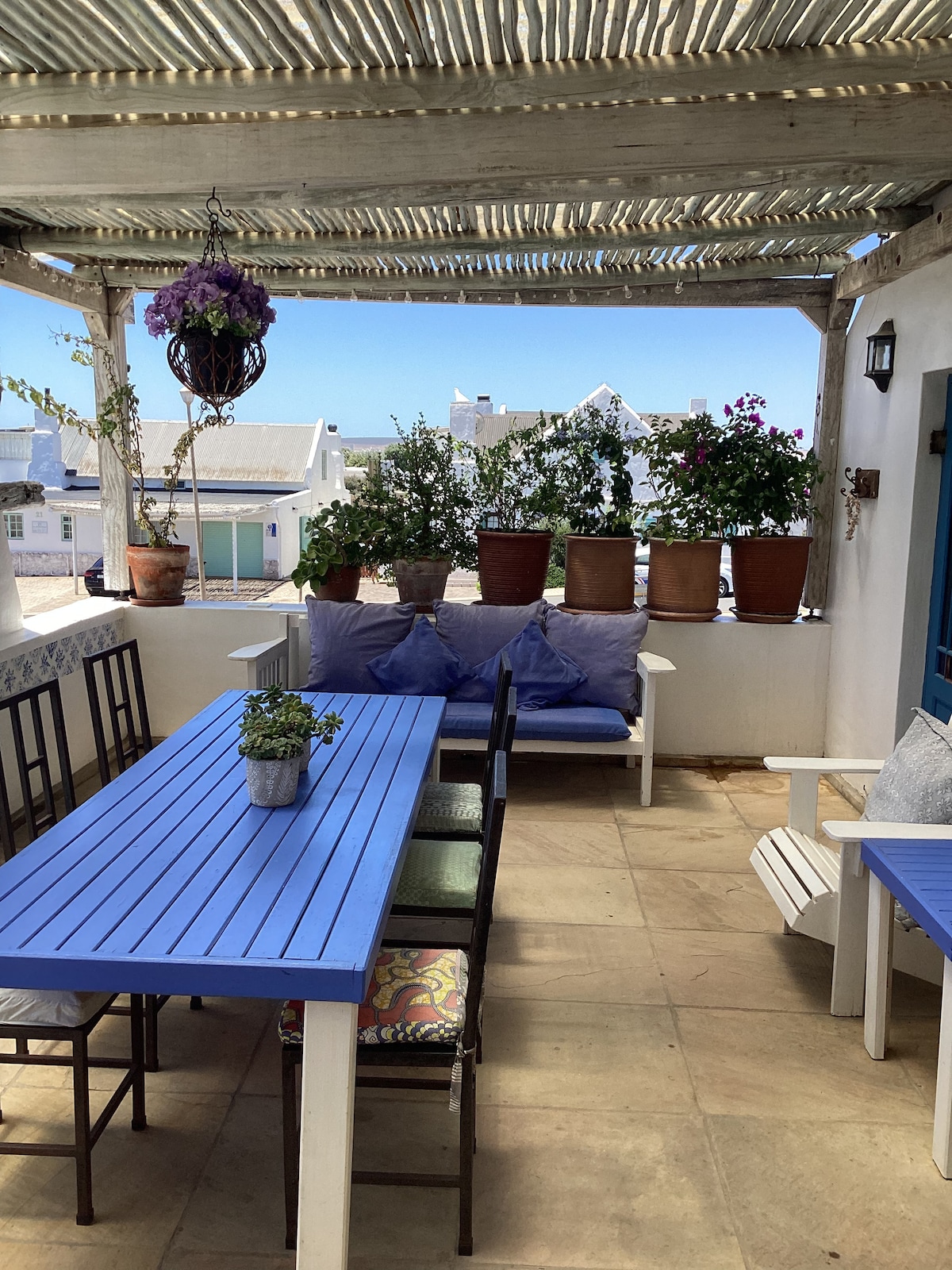 Unwind in an ocean view open-plan petite apartment (tiny and compact) on the West Coast nestled in a peaceful estate between Velddrif and Dwarskerbos, with a "Greek-style" stairway. Guests will appreciate the stunning ocean views from the balcony and morning walks on the beach. Truly a serene and relaxing breakaway. Guests can enjoy a shared swimming pool on the main property and have a separate boma in the private mini-courtyard. The beach access gate is a 1-2 minute walk from the unit.
