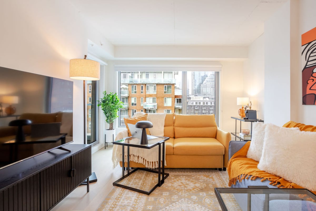 Welcome to your stylish home in the heart of downtown Montreal! This bright and spacious apartment is designed for comfort and convenience. What you’ll love: • Comfy queen bed + extra sofa bed for flexible sleeping arrangements • Fully equipped kitchen for home-cooked meal • Fast Wi-Fi and Smart TV for relaxing nights in Location highlights: • 2-minute walk to Concordia University • Close to Atwater Market & Sainte-Catherine Street • Easy access to metro stations and public transport