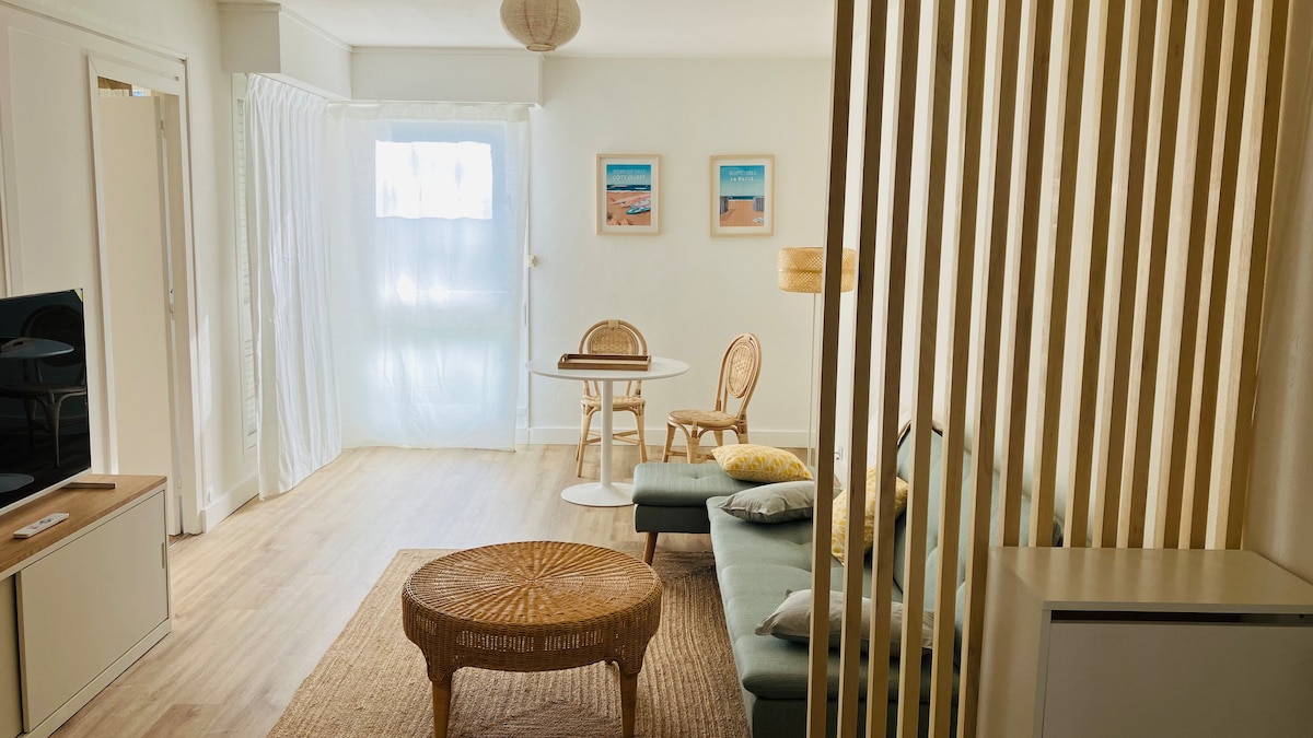 Dans une petite résidence calme, de trois logements, l'appartement se situe au rez-de-chaussée. Belle pièce de vie lumineuse, avec une décoration moderne et entièrement neuve. Canapé convertible en lit et confortable! Cuisine aménagée et équipée. Une chambre de 14 mètres carrés, une salle de bain, avec douche à l'italienne. Vous disposerez également d'un parking privatif, sécurisé par un portail électrique, et d'un jardinet pour les fumeurs. Barbecue possible!