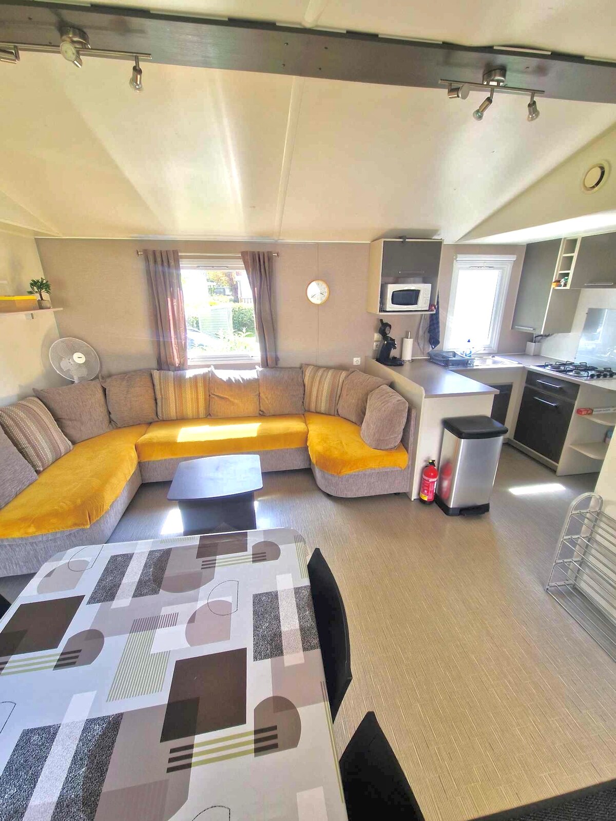 🏡 Mobile-home récent de 36 m² au camping 4⭐ Le Bois Masson, à 2 km de la plage 🏖️ de Saint-Jean-de-Monts. Avec 3 chambres 🛏️, il peut accueillir jusqu'à 8 personnes . Terrasse fermée, cuisine équipée 🍽️ (lave-vaisselle, machine à laver), TV 📺, chauffage 🔥, moustiquaires 🦟, plancha, salon de jardin 🌿. Wi-Fi en supplément 🌐. Linge fourni en option 🧺. Place de parking incluse 🚗. Animaux non acceptés 🚫🐕 et logement non-fumeur 🚭.