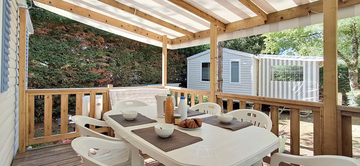 Mobil home au calme dans un cadre naturel et verdoyant entre mer et forêt. Un séjour de détente entre famille et/ou amis. Diverses activités sont proposées au sein du camping. Un minimum de deux nuits ( hors saison) et mini 4 nuits en saison et un maxi de trois semaines consécutives. À votre disposition un barbecue à gaz, télévision, un kit démarrage offert (éponge, papier toilette, chiffonnette et sac poubelle), grand frigo, cafetière, torchon et essuie main . Lits fait à votre arrivée