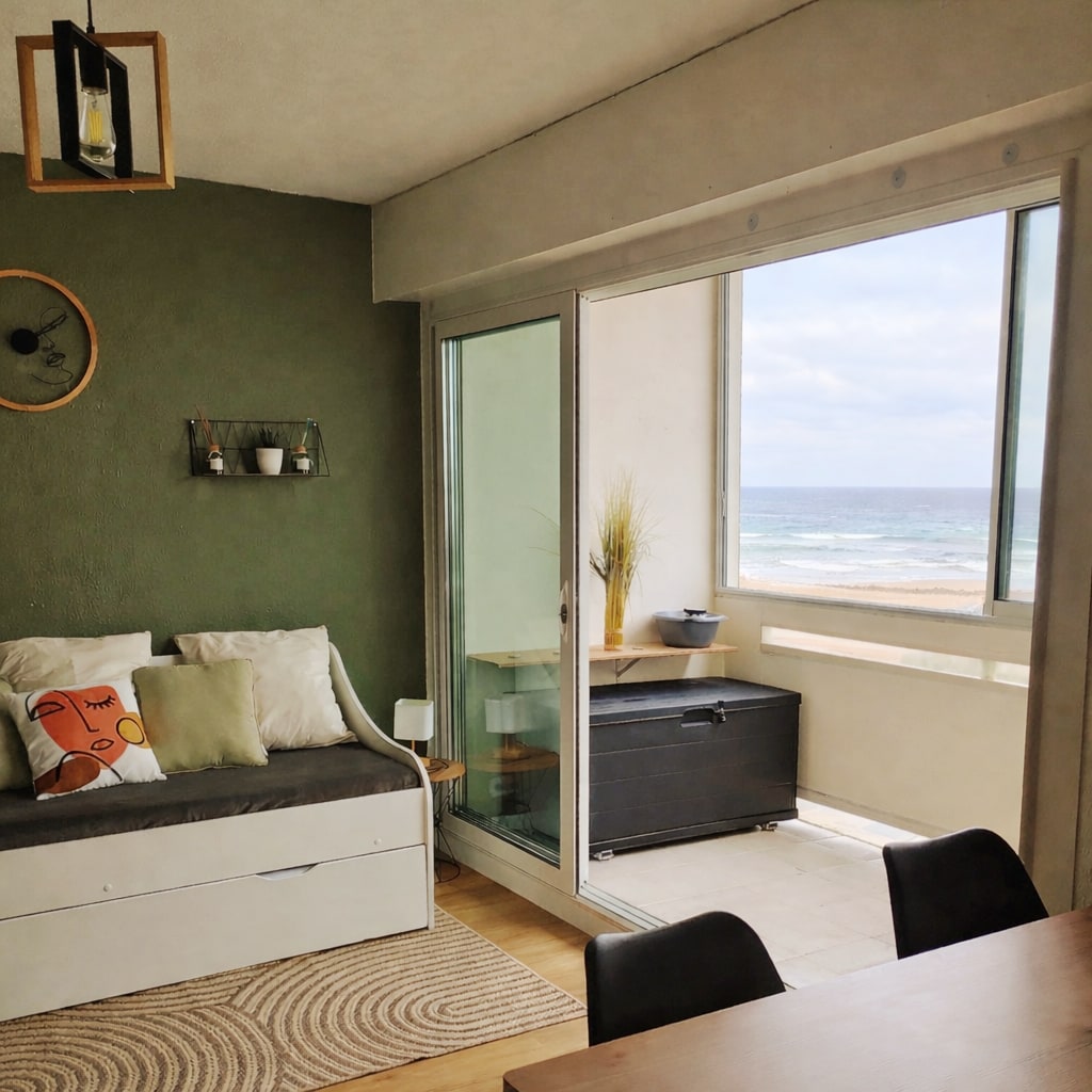 Face à la mer: profitez d'un panorama d'exception. Superbe appartement T2 (2/4 pers) rénové en 2024 - GRAND CONFORT. La plage et la dune sont au pied de l'appartement (sans route à traverser). Vue remarquable sur l'océan et l'île d'Yeu depuis l'espace repas, la loggia et même depuis le lit de votre chambre. Admirez les couchers de soleil en amoureux, en famille ou entre amis. Vous disposez de votre propre garage fermé; idéal pour votre voiture et pour ranger vélos, remorque et jeux de plage.