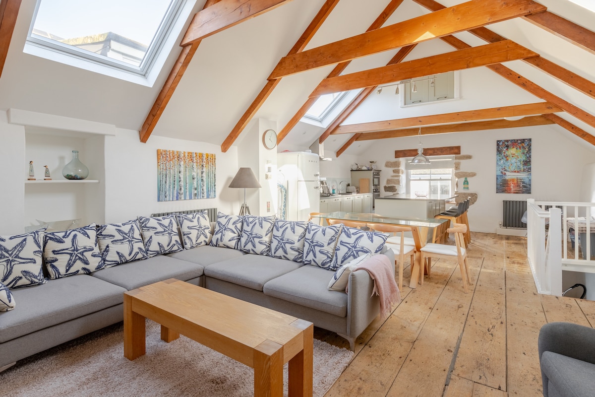 Fantastic High Spec Luxe Penthouse. Bifold doors open from the kitchen/living room onto a private south-facing balcony. The lower floor opens onto a deck with steps leading to a private garden. Modern fully fitted kitchen & living room with woodburner. Three bedrooms: Kingsized Master Bedroom; walk-in wardrobe, Double bedroom, and small double with an ensuite shower. Luxe Bathroom with walk-in rainforest shower. Hot Tub. (message for rate ) Superfast Fibre. Parking. BBQ. Dog friendly