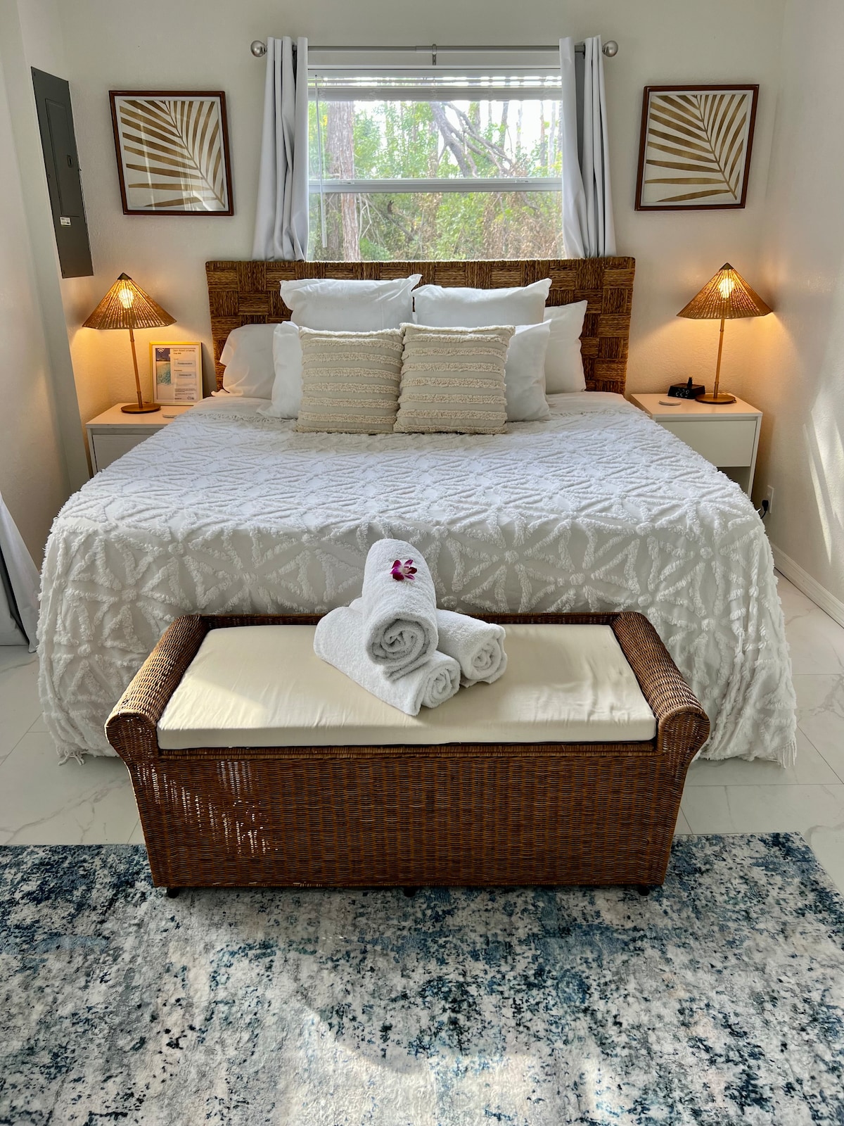 This picturesque Airbnb is a hidden gem nestled along a canal, one minute boat ride to the Caloosahatchee River. The living room, bathed in natural light is perfect for taking in the scenic views. The spacious bedroom has a king-size bed, ensuring a night of blissful rest. The full kitchen is equipped with all modern appliances. Close to Sanibel & Fort Myers Beach. Bring your boat & dock it on the seawall, ready to set sail whenever your heart desires. Book now - your coastal paradise awaits!