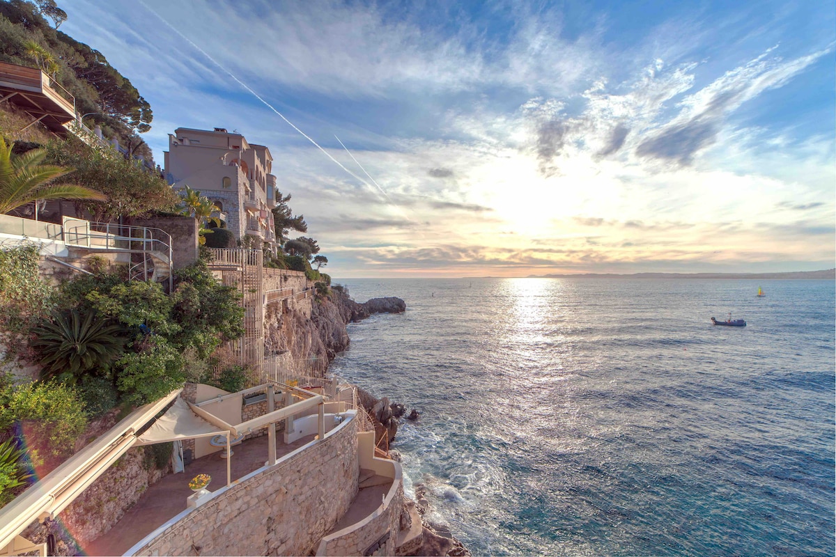 CAP DE NICE: Résidence sur un rocher. VUE FEERIQUE MER en première ligne Le Cap de Nice est très apprécié pour sa tranquillité, la proximité des commerces, et sa vue splendide sur la mer Logement d'exception de 40 m2 Rénové, et lumineux Décoration moderne Calme absolu Climatisation dans toutes les pièces WIFI Étage élevé terrasse profonde en front de mer Vous pourrez admirer les bateaux, les oiseaux et les pêcheurs du salon Une expérience unique Pour amateur d’exception