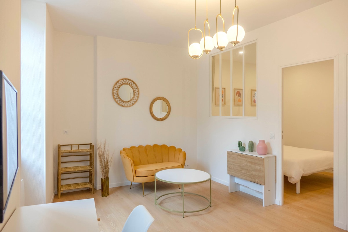 Profitez d’un logement, dans une cour commune (150 m de la Gare SNCF et autres commodités) pour vos séjours touristiques ou professionnels. - Lit 2 places en mezzanine (accessible à l’aide d’une échelle fixe linge de lit, oreillers) - Cuisine aménagée (four/micro-ondes, plaque, frigo, cafetière..) - Salle de douche avec WC (gel douche/corps, sèche-cheveux..) Et d’autres éléments qui vous permettrons de passer un excellent séjour (TV connectée, WIFI gratuite, climatisation..)