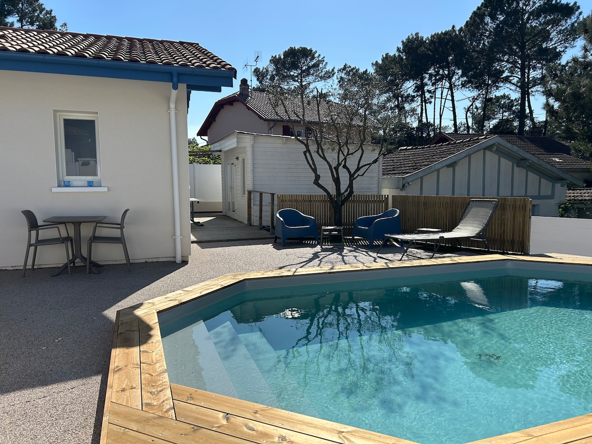Maison pour 4 personnes adultes (vrais lits) sur 2 niveaux avec : - salon et cuisine à l'américaine au 1er - mezzanine ouverte sur le salon - chambre individuelle fermée en rdc - Salle de douche et WC indépendants - Une mini-cour qui vous permet de bouquiner dehors et de rincer et stocker combis et surf
