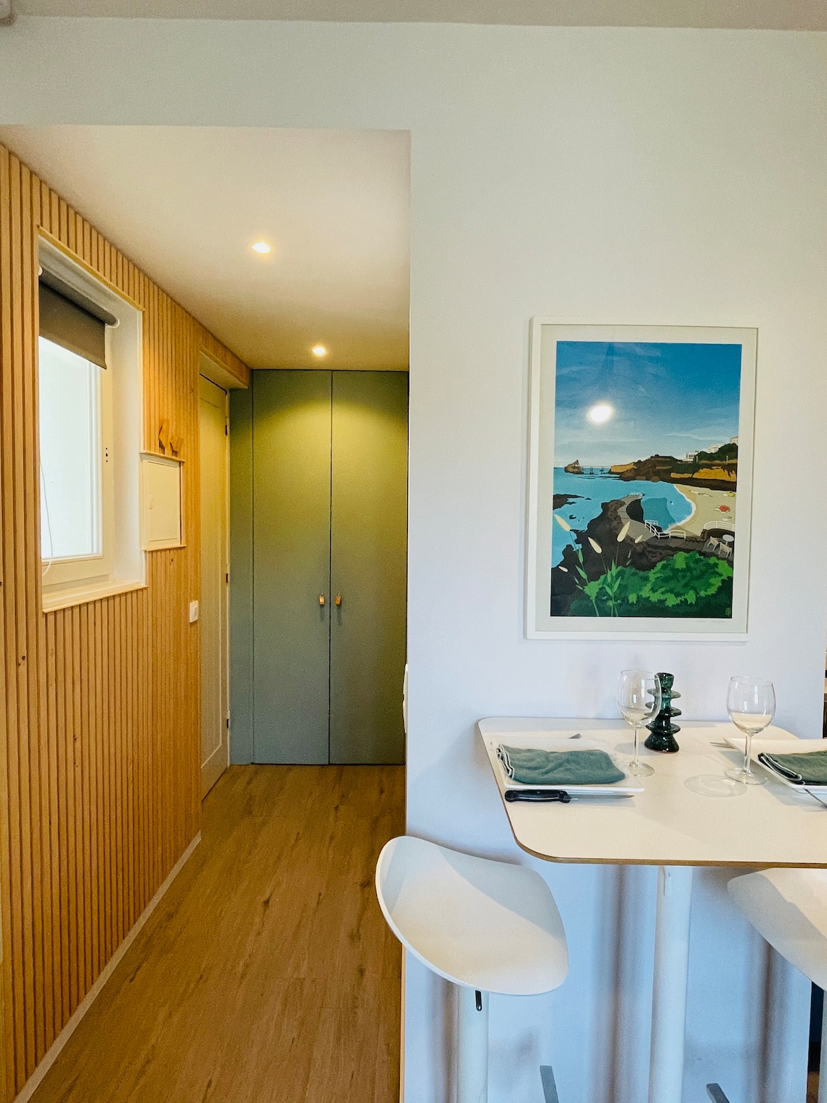 Appartement 2 pièces refait à neuf à côté de la plage avec Parking. L'appartement est entièrement équipé: télévision, Wifi Internet, grand frigo et congélateur, lave vaisselle, machine lavante séchante, Nespresso, grille pain, bouilloire, mixeur, table et fer à repasser. Pour le rangement, vous disposez de commodes, d'un dressing et d'un garage à vélo privatisé pour vos affaires de plage (surf, paddle, vélo...)