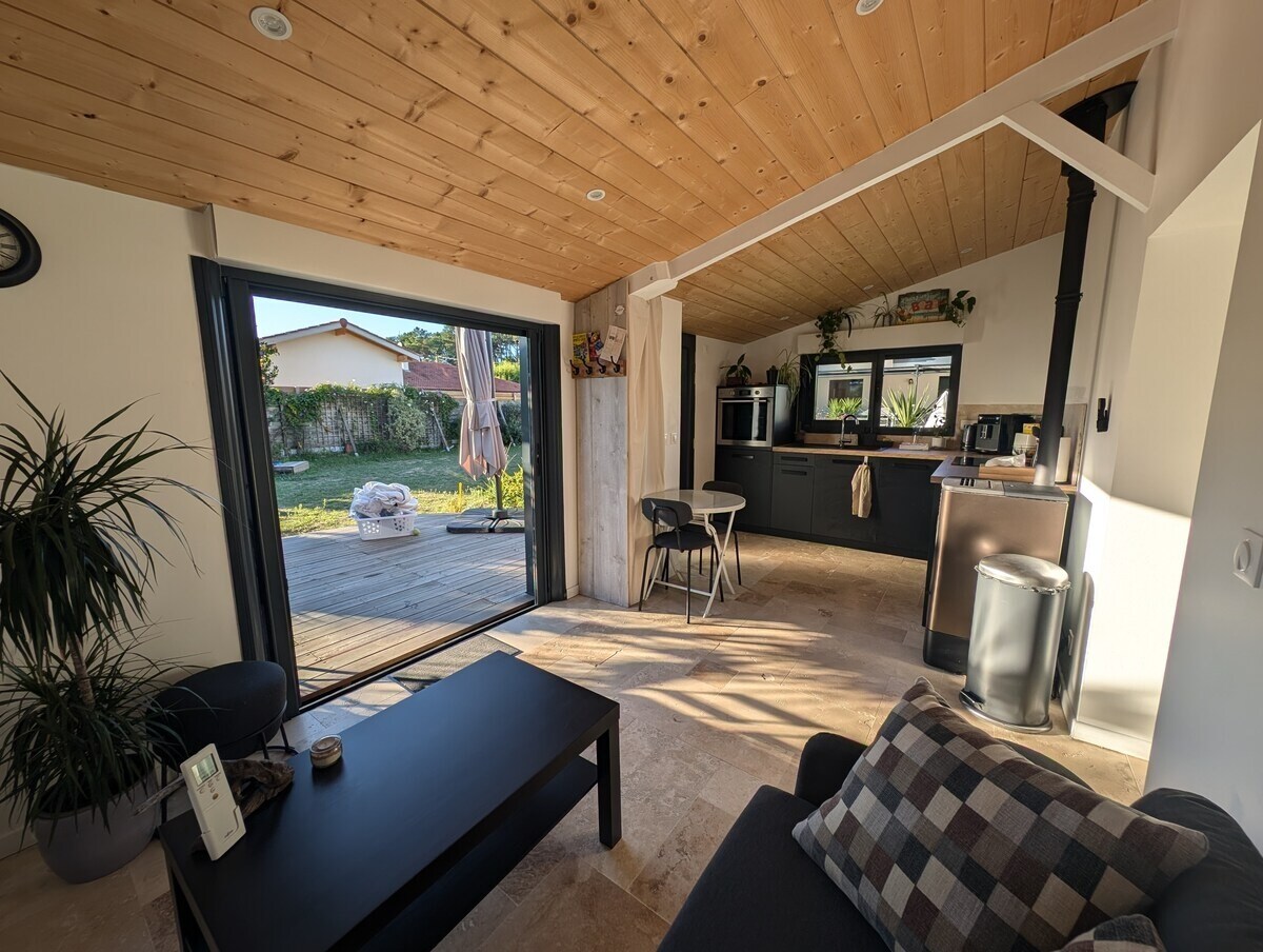 Studio moderne de 20m2 avec cuisine équipée, sdb avec une douche à l'italienne, lit en 160, télévision,et WiFi. Accès piscine chauffée ( de mai au 15 septembre) ,espace extérieur partagé avec les propriétaires ; jacuzzi réservé aux locataires. Le studio est attenant à notre maison mais l'entrée est indépendante. Situé à 10 mn en voiture des plages de Seignosse, Hossegor et Capbreton, à 25mn de Bayonne et 50 mn de l'Espagne. Nombreux départs de pistes cyclables. Parking fermé dans la cour.