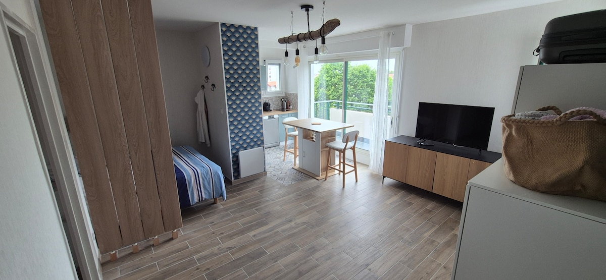 Ce bel appartement T2 proche des plages dispose d’une chambre indépendante, d’un salon, d’une salle d’eau et d’une terrasse de 21m2, dans une résidence de standing de mai 2015, situé dans le triangle d’or (5 Cantons) Résidence sécurisée. Tout proche des plages! Vous serez à 5’ de la plage et des commerces des fameuses Halles des 5 Cantons. L’environnement est très calme et très agréable. Place de parking privée dans la résidence. À vous le surf, le golf, les balades, le vélo...(VTT sur place)