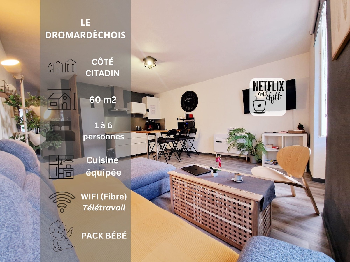 Pour des vacances en famille au pied du Vercors, un sejour en amoureux ou un déplacement professionnel, nous aurons le plaisir de vous accueillir dans un studio de 35 m² calme et lumineux dans une ambiance moderne et cosy. Fibre et Netflix Ses points forts : -Sa situation 12 min de la gare TGV de Valence. 18km de l'A7, 6 Km de l’A 49 (Grenoble) 1 h des pistes du domaine de Villard-de-Lans 25 min de Valence; 15 min de Romans-sur-Isère. A 5mn en voiture des commerces