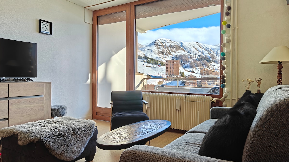 Studio cabine (32m²) à 80m du front de neige et du parking couvert. 5 couchages : coin nuit, fermé par des rideaux occultants : 1 lit 2 pers et 1 superposé 1 pers. salon : clic-clac 2 p Spacieux séjour avec cuisine équipée (micro-ondes /four-grill , cafetière senséo, appareils raclette et fondue, LV, TV, Wifi ; Balcon S/O. Magnifique vue sans vis à vis. Douche, WC, sèche-cheveux, fer. Casier à ski / vélo (2) Linge de lit, toilette, produits ménagers et de toilettes fournis. Ménage inclus.