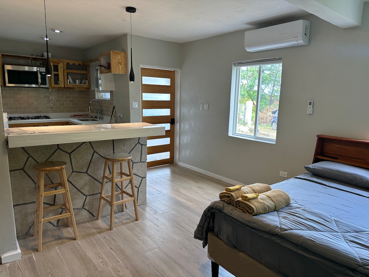 Unwind at this peaceful oasis. This clean, spacious, modern, studio apartment features a kitchenette, washer/dryer, dedicated garden area with a grill, and keypad entry. Located just 4 minutes from the airport with no air traffic noise, 10 minutes from the closest beach, and 10 minutes from the American University of Antigua. Includes WiFi, backup generator, and a whole house water filtering system. Perfect for travelers looking for a peaceful, quiet stay that provides convenience and comfort.