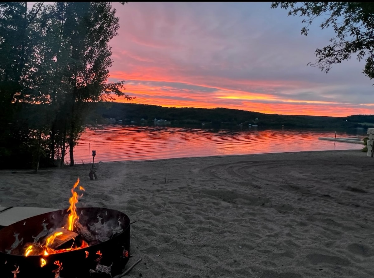 Relax with the whole family or a couples weekend getaway, enjoy the secluded fire pit or the private beach. This property sleeps 5, 2 bedrooms with queen beds and a pull out couch in the living area. Very close to all amenities 5 minutes to QPlex Arena 9 minutes to grocery 11 minutes to town center Kid friendly (1) High chair and pack and play available upon request. Firewood on site Parking on site Door code will be last 4 digits of your Airbnb linked phone number