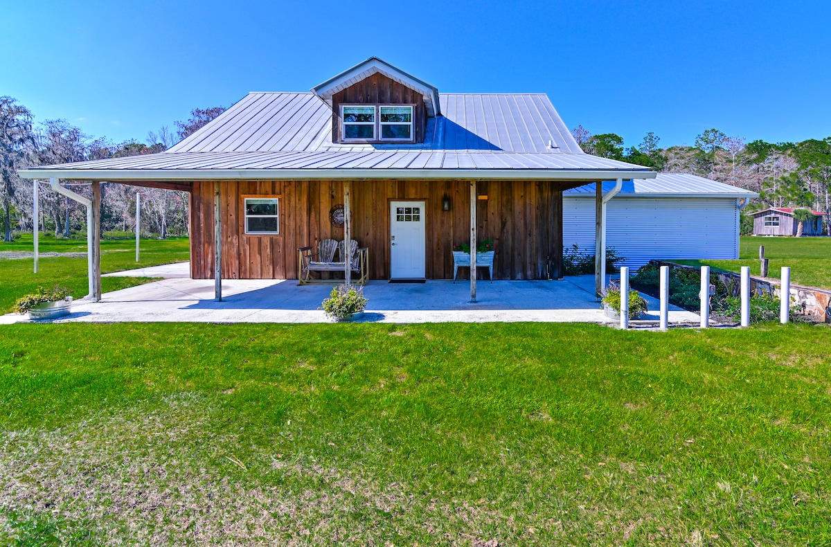 Experience the rustic elegance of this beautifully remodeled 1,800 sq. ft. barn nestled on a serene 17-acre property. Unwind in the private heated hot tub and soak up the peaceful surroundings. The prime location offers convenient access to major attractions—just a 35-45 min drive west will take you to Disney, Universal, SeaWorld, and gator parks, while a 45-60 min drive east leads you to the breathtaking Atlantic beaches and the Space Coast. Plus, the property is only 40 min from the airport