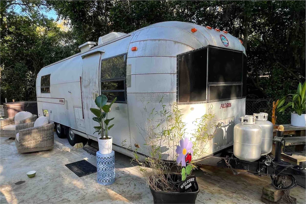 It’s the summer of 1969, and you just arrived at your campsite in Tampa in your 24 foot Avion travel cade camper. You’ve parked in a beautiful secluded campsite in Tampa that borders up to the woods. a full kitchen, in and outdoor shower, and queen bed. We keep it super clean and it is very private. The hot tub is an amazing feature. If it’s cool outside enjoy the propane fire pit. Turn a knob and push a button and it’s on!! This camper is perfect for one to two people and one small pet.