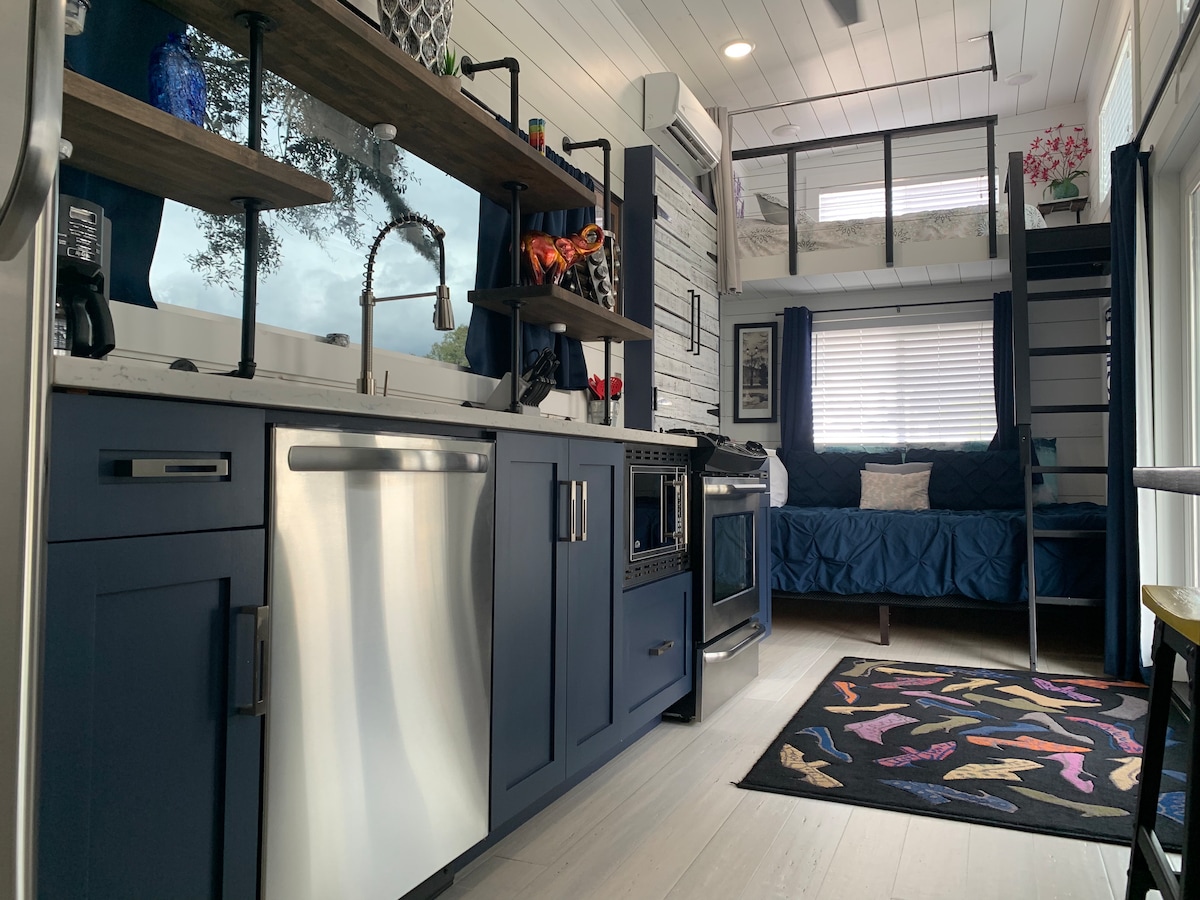 This stylish tiny house is perfect for a short or mid-term rental, featuring 2 lofts with twin beds, a queen bed on the main floor, a full bathroom with a large rain-head shower, and a gorgeous kitchen with full-size appliances. Enjoy a 7-foot projector screen that doubles as a TV and privacy divider, plus a lovely outdoor area with a gazebo, table, grill, and another TV ideal for experiencing tiny living in luxury with plenty of space. Also, check airbnb.com/h/tinyhamptonsjitney