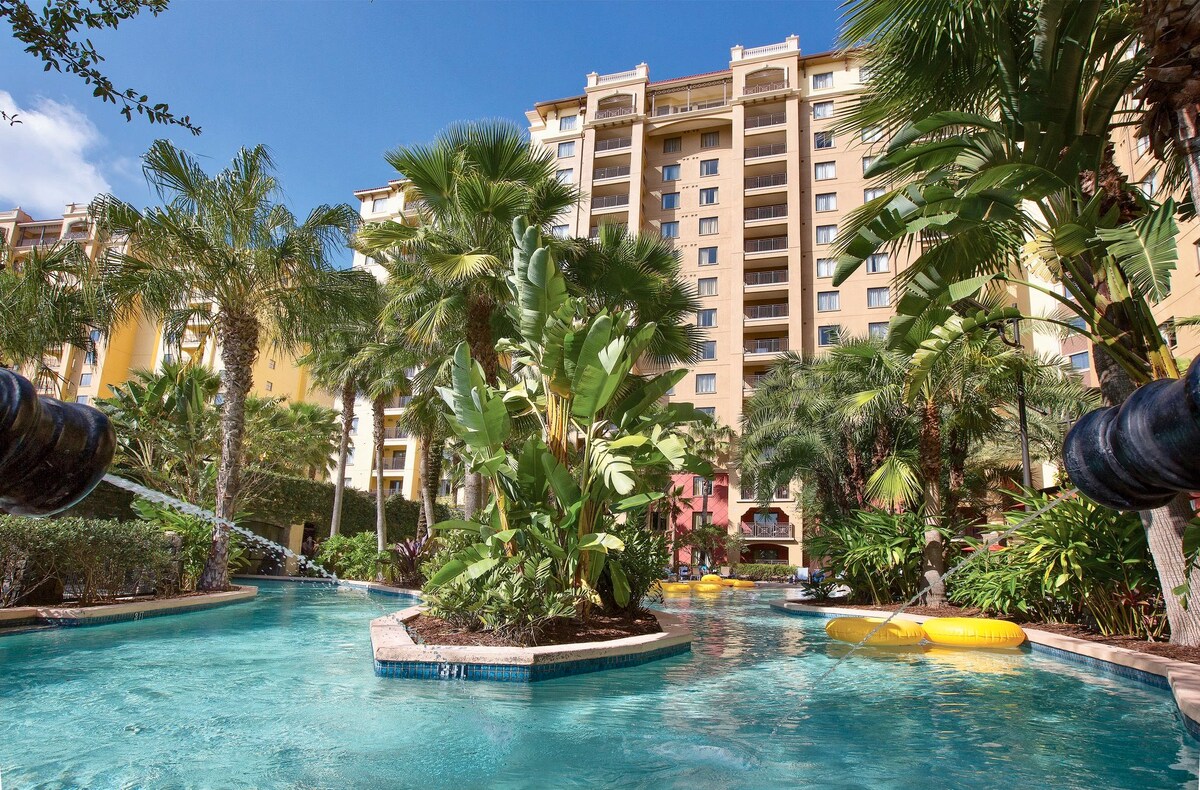 Discover a magical resort less than a mile from the gates of Walt Disney World®. When it's time to take a day off from the parks, chill out at the resort's five pools, lazy rivers and private rental cabanas or schedule time for some pampering at the spa. Ranked No. 10 on Condé Nast Traveler's "Best Resorts in Orlando, Florida: Readers' Choice Awards 2015." This is a 2 bdrm /2 bath just a mile from Disney Springs.